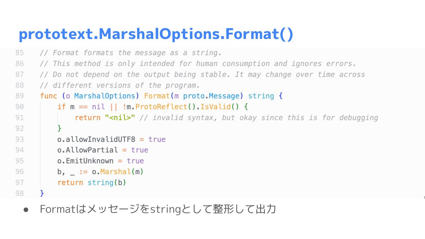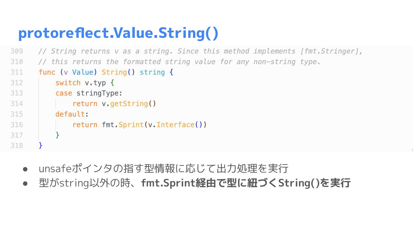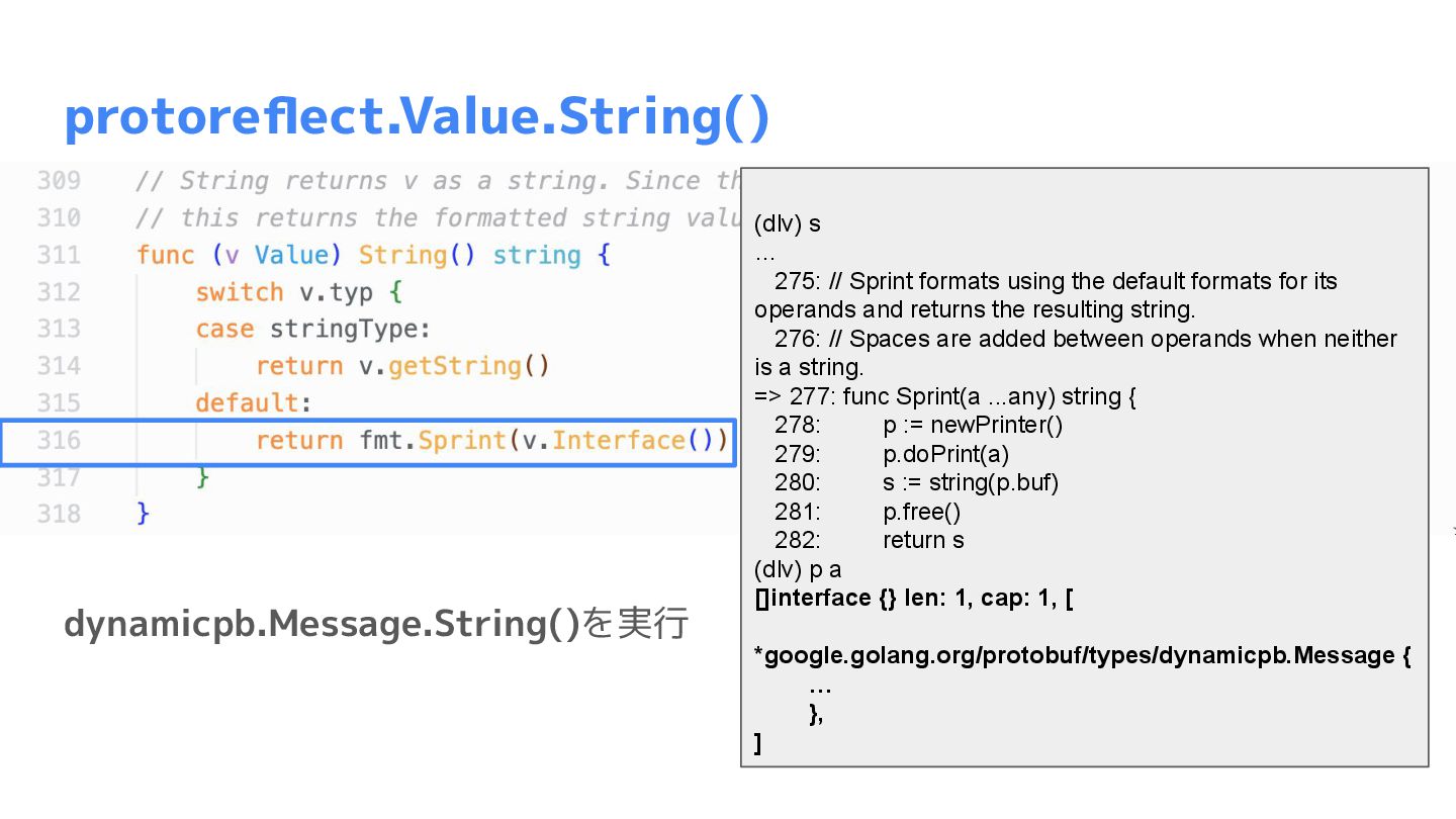 the default formats for its operands and returns the resulting string. 276: // Spaces are added between operands when neither is a string. => 277: func Sprint(a ...any) string { 278: p := newPrinter() 279: p.doPrint(a) 280: s := string(p.buf) 281: p.free() 282: return s (dlv) p a []interface {} len: 1, cap: 1, [ *google.golang.org/protobuf/types/dynamicpb.Message { … }, ]