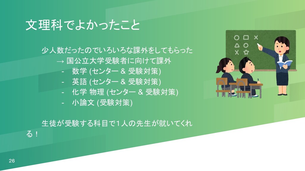 高校生活 文理科で良かったこと - 少人数だったのでいろいろな課外をやってもらえた - 仲間ができた - 勉強を楽しむことができた 自分のときの文理科 →