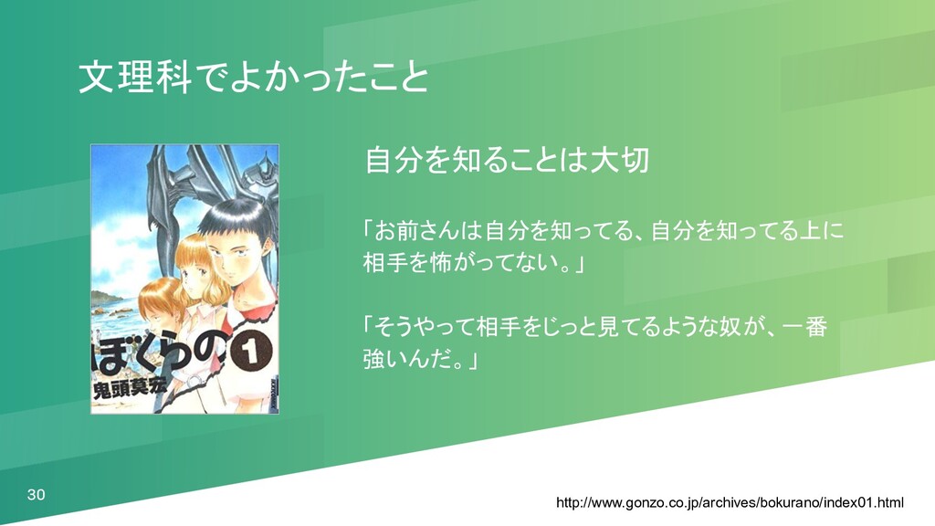文理科でよかったこと 自分を知ることは大切 「お前さんは自分を知ってる、自分を知ってる上に 相手を怖がってない。」 「そうやって相手をじっと見てるような奴が、一番 強いんだ。」 30 http://www.gonzo.co.jp/archives/bokurano/index01.html