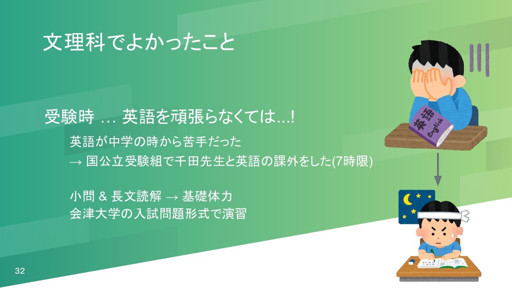 文理科でよかったこと 受験時 … 英語を頑張らなくては...! 英語が中学の時から苦手だった → 国公立受験組で千田先生と英語の課外をした(7時限) 小問 & 長文読解