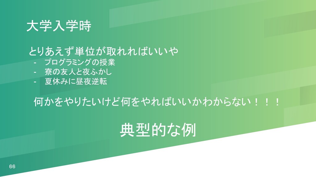 66 大学入学時 とりあえず単位が取れればいいや - プログラミングの授業 - 寮の友人と夜ふかし - 夏休みに昼夜逆転 何かをやりたいけど何をやればいいかわからない!!!