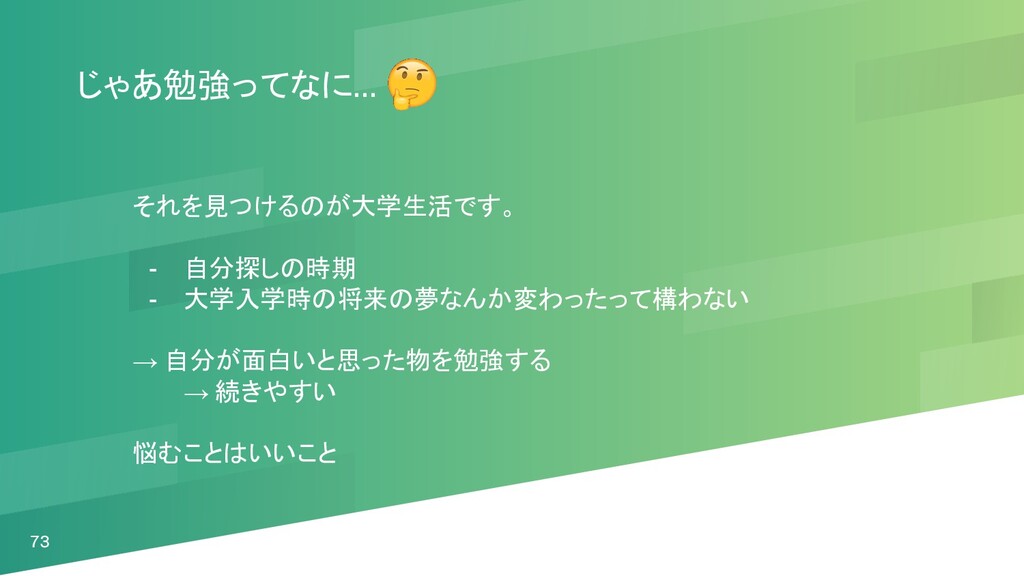 73 じゃあ勉強ってなに... それを見つけるのが大学生活です。 - 自分探しの時期 - 大学入学時の将来の夢なんか変わったって構わない → 自分が面白いと思った物を勉強する →