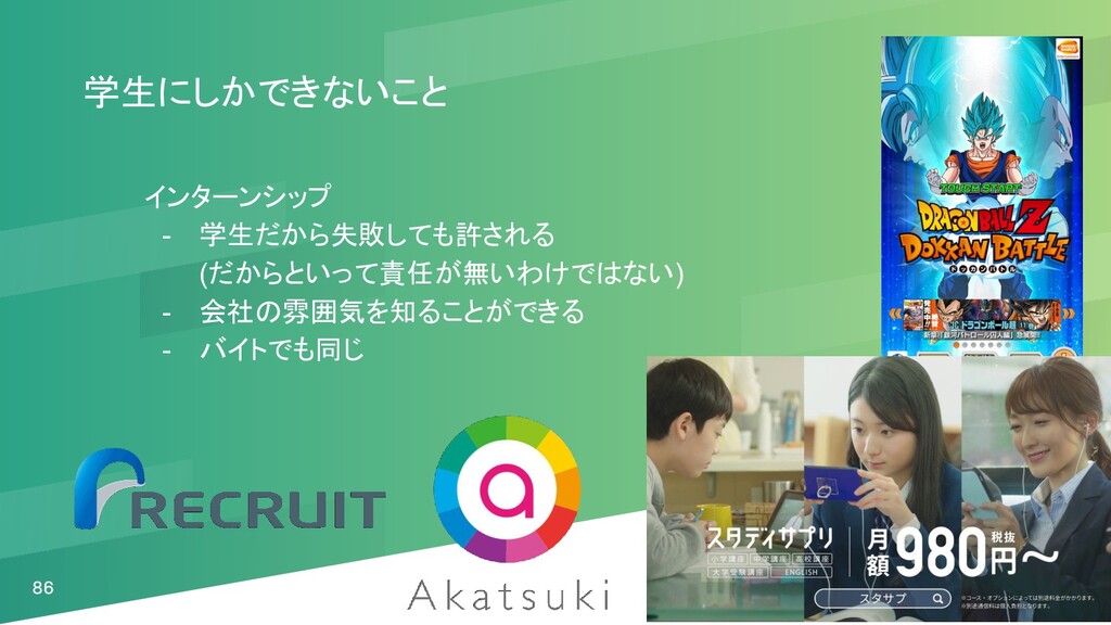 86 学生にしかできないこと インターンシップ - 学生だから失敗しても許される (だからといって責任が無いわけではない) - 会社の雰囲気を知ることができる - バイトでも同じ