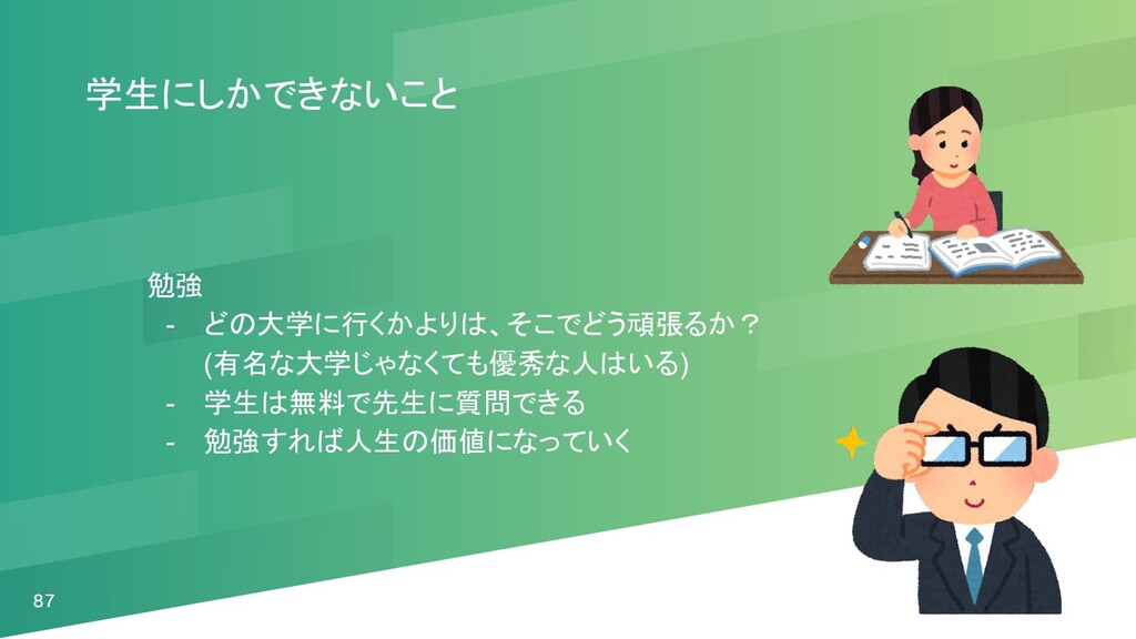 87 学生にしかできないこと 勉強 - どの大学に行くかよりは、そこでどう頑張るか? (有名な大学じゃなくても優秀な人はいる) - 学生は無料で先生に質問できる - 勉強すれば人生の価値になっていく