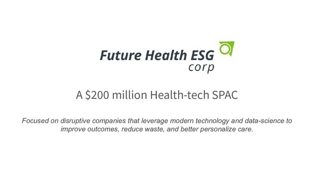of the Securities Act of 1933, as amended, and in reliance on your representation that you are a qualified institutional buyer or an institutional accredited investor as such terms are defined in the federal securities laws. These materials are not an offer to sell, and are not seeking an offer to buy, any securities of Future Health ESG Corp (the “Company,” “us,” “we” or “our”). The Company’s securities may only be sold pursuant to an effective registration statement filed with the Securities and Exchange Commission. The information provided herein is provided to you on the condition that you agree that you will hold it in strict confidence and not reproduce it or disclose it to any third party in whole or in part. By receiving this information, the recipient expressly agrees to maintain the confidentiality of the material and information herein and to use any such material and information in accordance with its compliance policies, contractual obligations and applicable law, including federal and state securities laws. The statements contained in this presentation that are not purely historical are forward looking statements. Our forward looking statements include, but are not limited to, statements regarding our or our management team's expectations, hopes, beliefs, intentions or strategies regarding the future. In addition, any statements that refer to projections, forecasts or other characterizations of future events or circumstances, including any underlying assumptions, are forward looking statements. The words "anticipate," "continue,“ "could,“ "estimate,“ "expect,“ "intends,“ "may,“ "might,“ "plan, "possible,“ "potential,“ predict,“ "project,“ "should," and similar expressions may identify forward looking statements, but the absence of these words does not mean that a statement is not forward looking. The forward looking statements contained in this presentation are based on our current expectations and beliefs concerning future developments and their potential effects on us. There can be no assurance that future developments affecting us will be those that we have anticipated. These forward looking statements involve a number of risks, uncertainties (some of which are beyond our control) or other assumptions that may cause actual results or performance to be materially different from those expressed or implied by these forward looking statements. Should one or more of these risks or uncertainties materialize, or should any of our assumptions prove incorrect, actual results may vary in material respects from those projected in these forward looking statements. We undertake no obligation to update or revise any forward looking statements, whether as a result of new information, future events or otherwise, except as may be required under applicable securities laws. The past performance of our management team and their affiliates, or businesses with which they are or have been associated, is not a guarantee that we will be able to identify a suitable candidate for our initial business combination or of success with respect to any business combination we may consummate. You should not rely on the historical record or past performance of our management team or their affiliates or the businesses with which they are or have been associated as indicative of our future performance. Certain market data information in this presentation is based on management’s estimates. We obtained the industry, market and competitive position data used throughout this presentation from internal estimates and research as well as from industry publications and research, surveys and studies conducted by third parties. We believe the estimates to be accurate as of the date of this presentation. However, this information may prove to be inaccurate because of the method by which we obtained some of the data for our estimates or because this information cannot always be verified due to the limits on the availability and reliability of raw data, and the voluntary nature of the data gathering process. 2