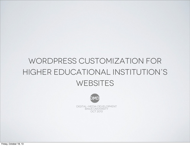 event from every department • Must maintain dozens of WordPress installation WordPress Customization for Higher Educational Institution’s Websites DIGITAL-MEDIA DEVELOPMENT • BINUS UNIVERSITY Friday, October 18, 13