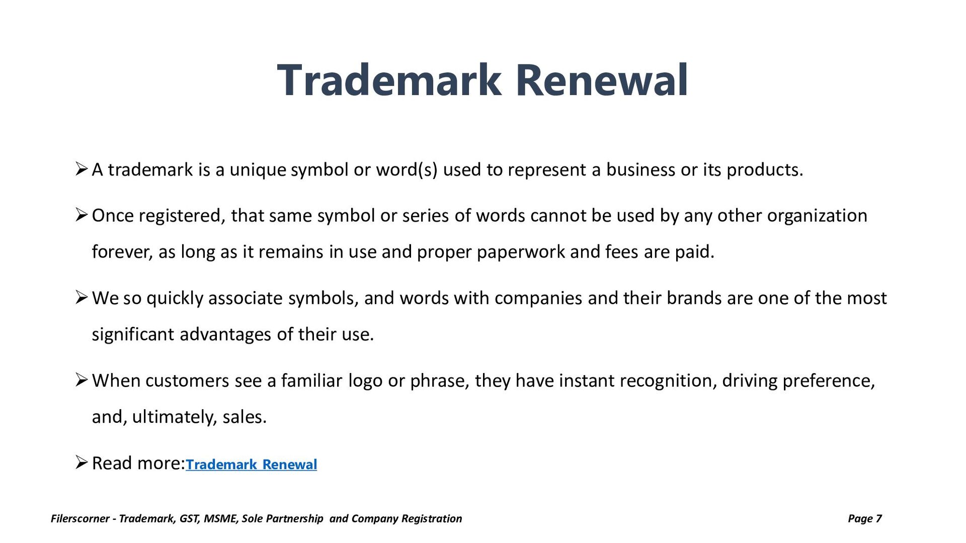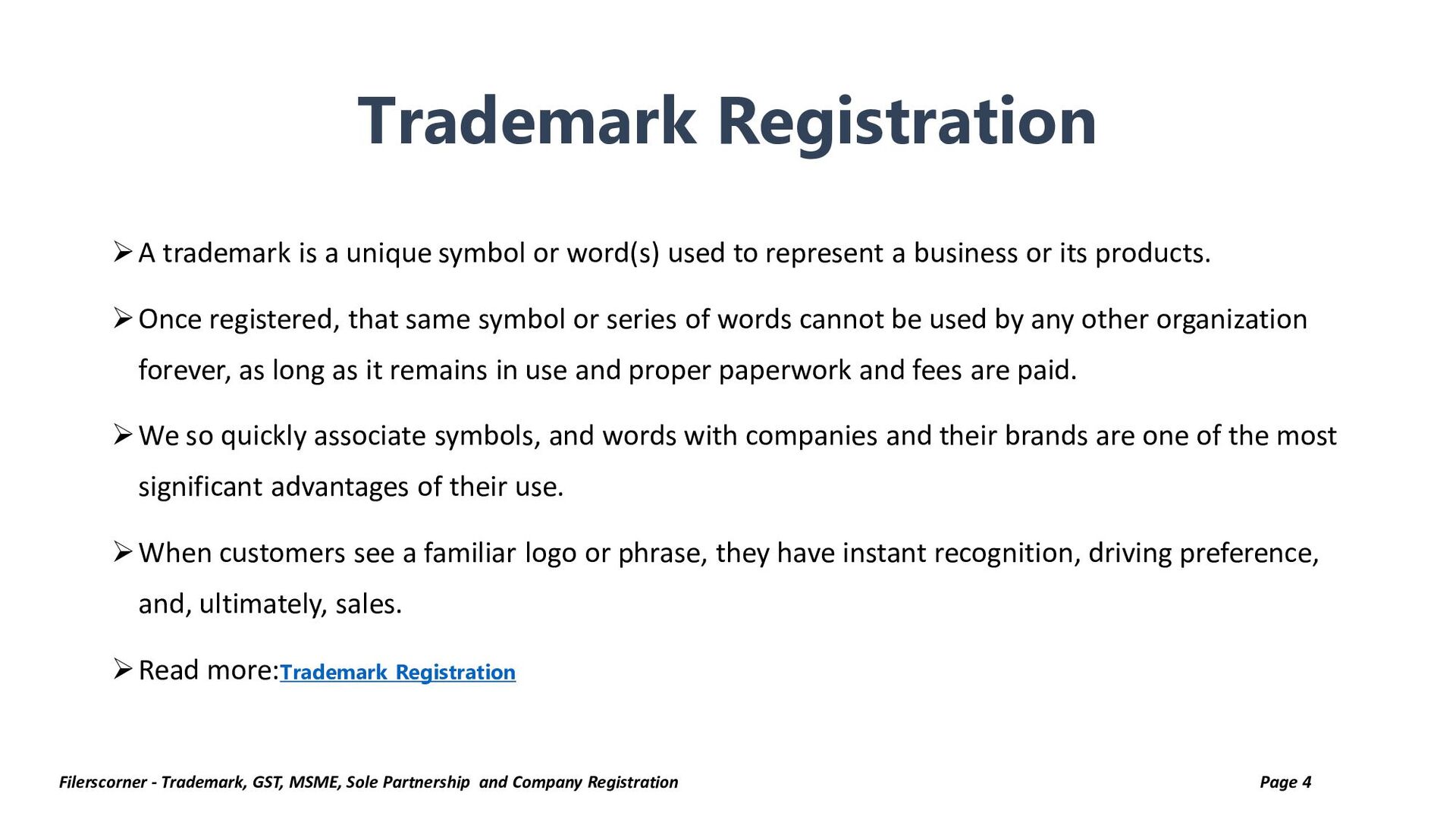 A trademark is a unique symbol or word(s) used to represent a business or its products. Once registered, that same symbol or series of words cannot be used by any other organization forever, as long as it remains in use and proper paperwork and fees are paid.