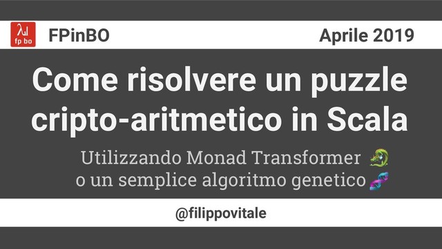 // 45 combinazioni // Vector(0, 1, 2, 3, 4, 5, 6, 7) // (8, 9) // Vector(0, 1, 2, 3, 4, 5, 6, 8) // (7, 9) // Vector(0, 1, 2, 3, 4, 5, 6, 9) // (7, 8) // Vector(0, 1, 2, 3, 4, 5, 7, 8) // (6, 9) // Vector(0, 1, 2, 3, 4, 5, 7, 9) // (6, 8) // Vector(0, 1, 2, 3, 4, 5, 8, 9) // (6, 7) // Vector(0, 1, 2, 3, 4, 6, 7, 8) // (5, 9) // Vector(0, 1, 2, 3, 4, 6, 7, 9) // (5, 8) // Vector(0, 1, 2, 3, 4, 6, 8, 9) // (5, 7) // ... } yield ("sendmoremoney".distinct zip ???).toMap Ricerca soluzioni teoricamente possibili Verifica vincoli