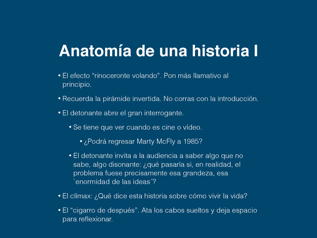 Algo sorprendente. La verdad es que… • Utiliza situaciones reales pero sé creativo. Busca la ironía, el humor o la sorpresa. Muéstrate vulnerable. Comparte tu diálogo interno (miedos). • Sé concreto. Nombra a personas. Utiliza el lugar, el contexto. • El lenguaje de la historia son las conexiones. Asocia tu historia con otras ideas o temas: • Sírvete del lenguaje de las emociones, la empatía y la belleza. • Se breve. Lo normal es escribir más de lo que necesitamos. Escribe un primer borrador. Descansa. Edita sin piedad. Descansa. Edita sin piedad. • Evita utilizar en exceso preposiciones, pronombres y conjunciones (pero, porque, aunque,…) o adverbios que rompan el ritmo del relato. • Acaba con un final contundente. Deja una idea, un mensaje para llevar. Utiliza un giro inesperado que de un nuevo sentido a tu historia.