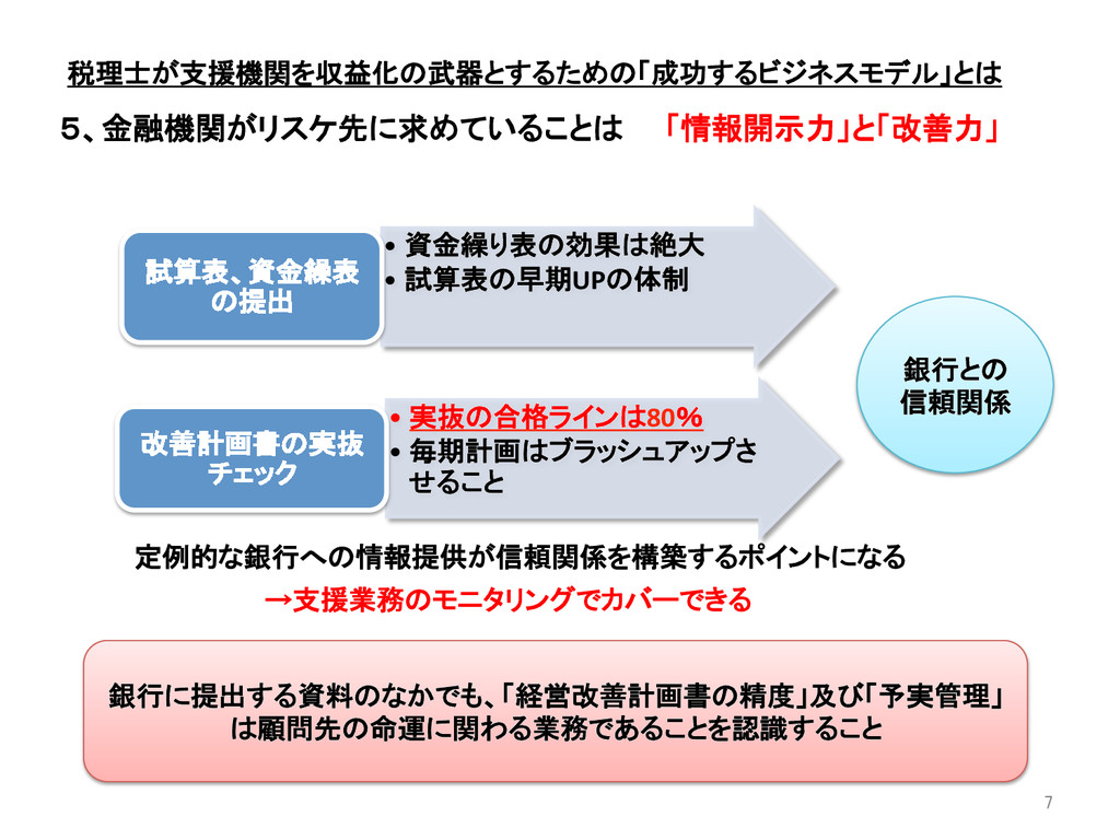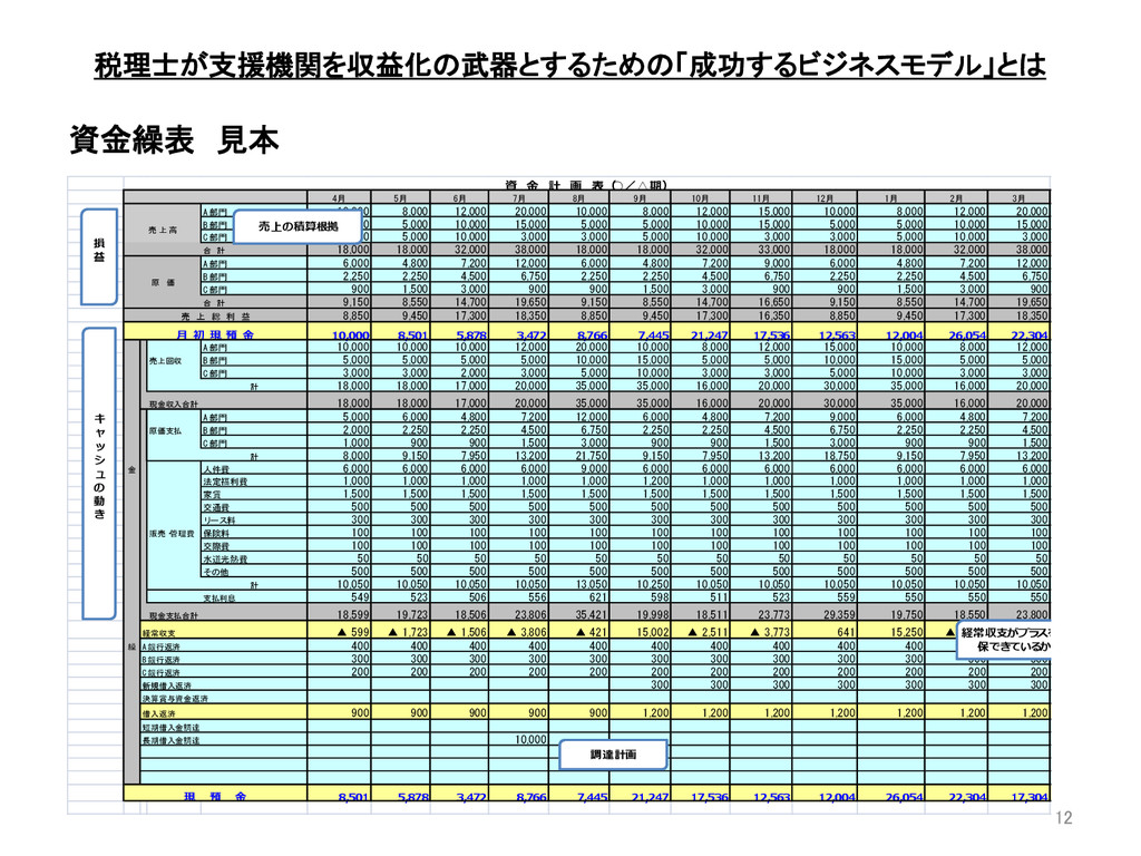 5月 6月 7月 8月 9月 10月 11月 12月 1月 2月 3月 A 部門 10, 000 8, 000 12, 000 20, 000 10, 000 8, 000 12, 000 15, 000 10, 000 8, 000 12, 000 20, 000 B 部門 5, 000 5, 000 10, 000 15, 000 5, 000 5, 000 10, 000 15, 000 5, 000 5, 000 10, 000 15, 000 C 部門 3, 000 5, 000 10, 000 3, 000 3, 000 5, 000 10, 000 3, 000 3, 000 5, 000 10, 000 3, 000 合 計 18, 000 18, 000 32, 000 38, 000 18, 000 18, 000 32, 000 33, 000 18, 000 18, 000 32, 000 38, 000 A 部門 6, 000 4, 800 7, 200 12, 000 6, 000 4, 800 7, 200 9, 000 6, 000 4, 800 7, 200 12, 000 B 部門 2, 250 2, 250 4, 500 6, 750 2, 250 2, 250 4, 500 6, 750 2, 250 2, 250 4, 500 6, 750 C 部門 900 1, 500 3, 000 900 900 1, 500 3, 000 900 900 1, 500 3, 000 900 合 計 9, 150 8, 550 14, 700 19, 650 9, 150 8, 550 14, 700 16, 650 9, 150 8, 550 14, 700 19, 650 8, 850 9, 450 17, 300 18, 350 8, 850 9, 450 17, 300 16, 350 8, 850 9, 450 17, 300 18, 350 10,000 8,501 5,878 3,472 8,766 7,445 21,247 17,536 12,563 12,004 26,054 22,304 A 部門 10, 000 10, 000 10, 000 12, 000 20, 000 10, 000 8, 000 12, 000 15, 000 10, 000 8, 000 12, 000 売上回収 B 部門 5, 000 5, 000 5, 000 5, 000 10, 000 15, 000 5, 000 5, 000 10, 000 15, 000 5, 000 5, 000 C 部門 3, 000 3, 000 2, 000 3, 000 5, 000 10, 000 3, 000 3, 000 5, 000 10, 000 3, 000 3, 000 計 18, 000 18, 000 17, 000 20, 000 35, 000 35, 000 16, 000 20, 000 30, 000 35, 000 16, 000 20, 000 現金収入合計 18, 000 18, 000 17, 000 20, 000 35, 000 35, 000 16, 000 20, 000 30, 000 35, 000 16, 000 20, 000 A 部門 5, 000 6, 000 4, 800 7, 200 12, 000 6, 000 4, 800 7, 200 9, 000 6, 000 4, 800 7, 200 原価支払 B 部門 2, 000 2, 250 2, 250 4, 500 6, 750 2, 250 2, 250 4, 500 6, 750 2, 250 2, 250 4, 500 C 部門 1, 000 900 900 1, 500 3, 000 900 900 1, 500 3, 000 900 900 1, 500 計 8, 000 9, 150 7, 950 13, 200 21, 750 9, 150 7, 950 13, 200 18, 750 9, 150 7, 950 13, 200 金 人件費 6, 000 6, 000 6, 000 6, 000 9, 000 6, 000 6, 000 6, 000 6, 000 6, 000 6, 000 6, 000 法定福利費 1, 000 1, 000 1, 000 1, 000 1, 000 1, 200 1, 000 1, 000 1, 000 1, 000 1, 000 1, 000 家賃 1, 500 1, 500 1, 500 1, 500 1, 500 1, 500 1, 500 1, 500 1, 500 1, 500 1, 500 1, 500 交通費 500 500 500 500 500 500 500 500 500 500 500 500 リ ース料 300 300 300 300 300 300 300 300 300 300 300 300 販売・ 管理費 保険料 100 100 100 100 100 100 100 100 100 100 100 100 交際費 100 100 100 100 100 100 100 100 100 100 100 100 水道光熱費 50 50 50 50 50 50 50 50 50 50 50 50 その他 500 500 500 500 500 500 500 500 500 500 500 500 計 10, 050 10, 050 10, 050 10, 050 13, 050 10, 250 10, 050 10, 050 10, 050 10, 050 10, 050 10, 050 支払利息 549 523 506 556 621 598 511 523 559 550 550 550 現金支払合計 18, 599 19, 723 18, 506 23, 806 35, 421 19, 998 18, 511 23, 773 29, 359 19, 750 18, 550 23, 800 経常収支 ▲ 599 ▲ 1, 723 ▲ 1, 506 ▲ 3, 806 ▲ 421 15, 002 ▲ 2, 511 ▲ 3, 773 641 15, 250 ▲ 2, 550 ▲ 3, 800 繰 A銀行返済 400 400 400 400 400 400 400 400 400 400 400 400 B銀行返済 300 300 300 300 300 300 300 300 300 300 300 300 C銀行返済 200 200 200 200 200 200 200 200 200 200 200 200 新規借入返済 300 300 300 300 300 300 300 決算賞与資金返済 900 900 900 900 900 1, 200 1, 200 1, 200 1, 200 1, 200 1, 200 1, 200 短期借入金調達 長期借入金調達 10, 000 8,501 5,878 3,472 8,766 7,445 21,247 17,536 12,563 12,004 26,054 22,304 17,304 資 ⾦金金 計 画 表( ◦/△期) 売 上 高 原 価 売 上 総 利 益 現 預 ⾦金金 ⽉月 初 現 預 ⾦金金 借入返済 損 益 キ ャ ッ シ ュ の 動 き 売上の積算根拠 調達計画 経常収⽀支がプラ スを 確 保できている か