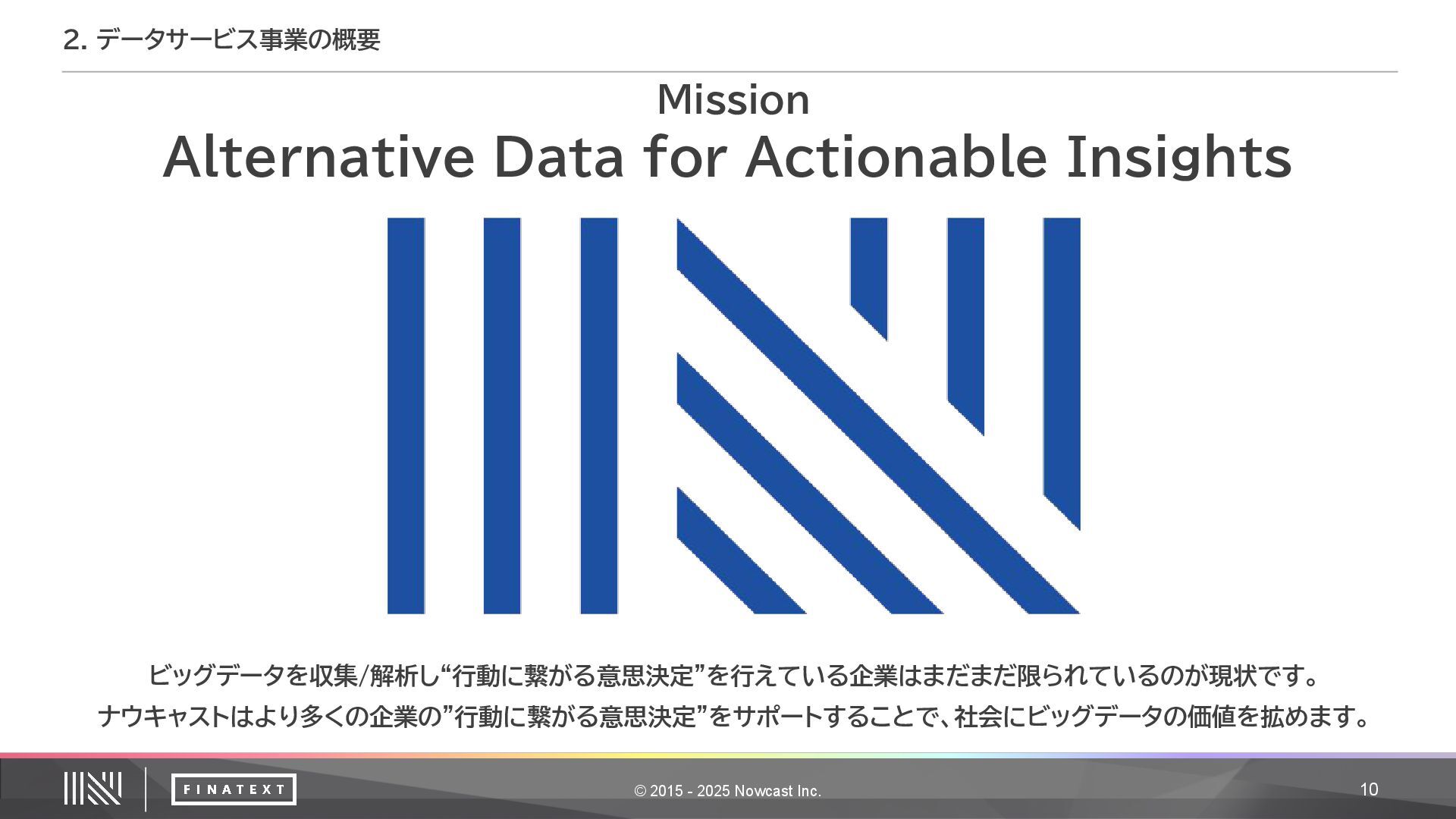 「Alternative Data for Actionable Insights」をミッションとし、より多くの企業の”行動に繋がる意思決定”をサポートすることで、社会にビッグデータの価値を拡めていきます。