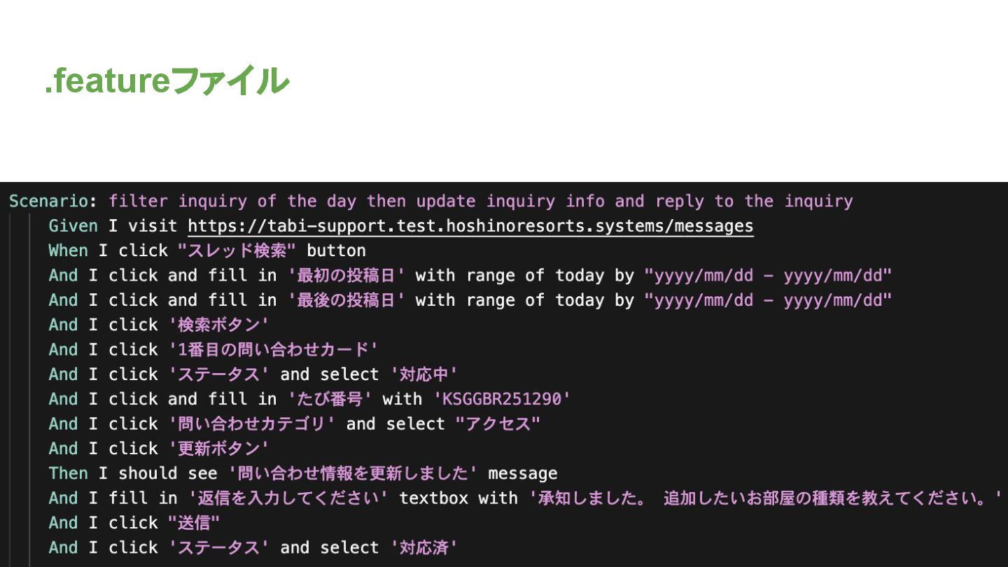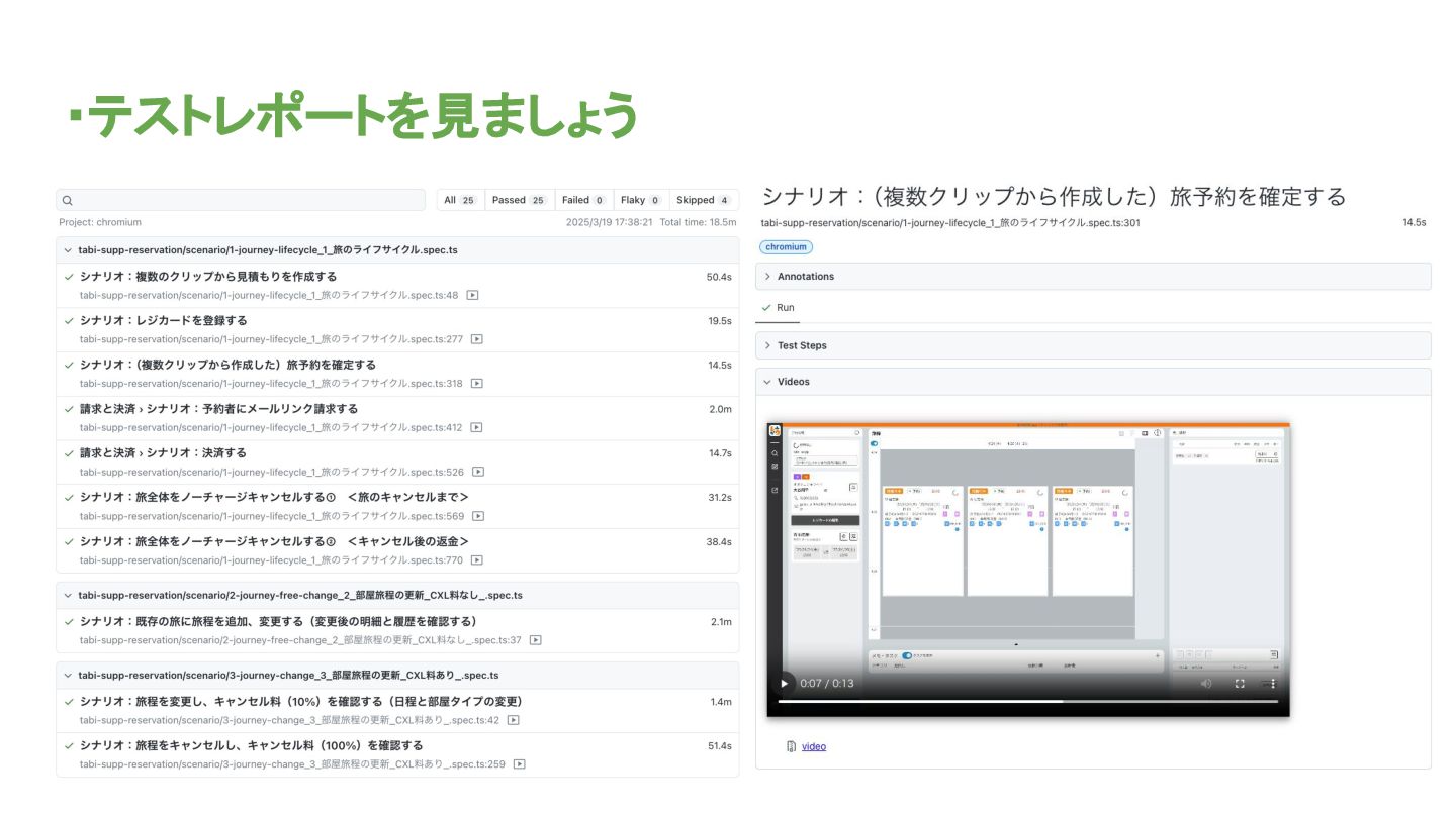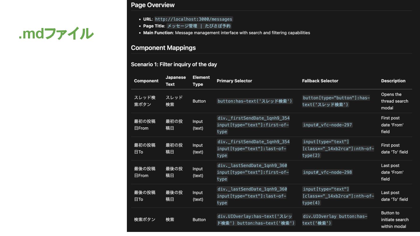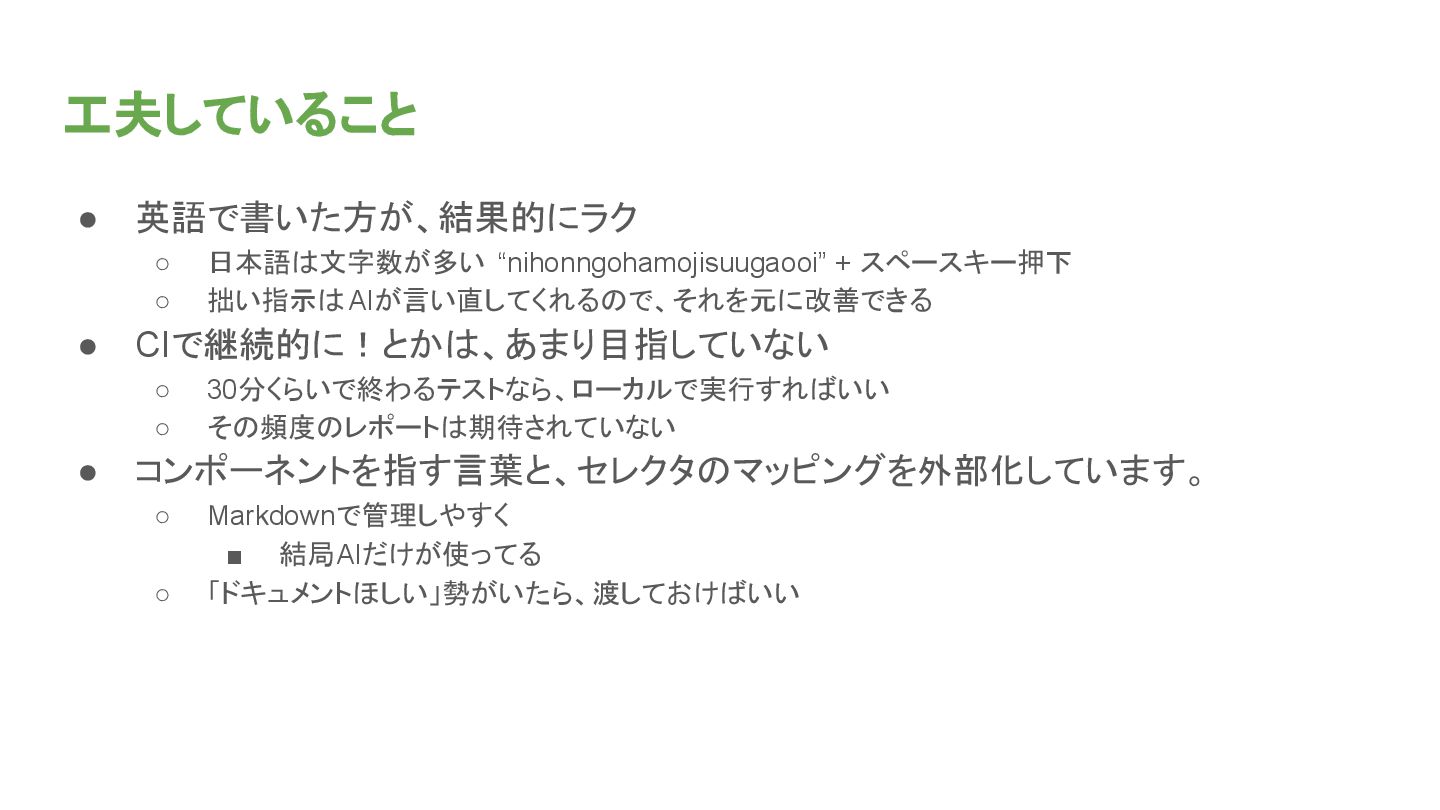 • CIで継続的に!とかは、あまり目指していない ◦ 30分くらいで終わるテストなら、ローカルで実行すればいい ◦ その頻度のレポートは期待されていない • コンポーネントを指す言葉と、セレクタのマッピングを外部化しています。 ◦ Markdownで管理しやすく ▪ 結局AIだけが使ってる ◦ 「ドキュメントほしい」勢がいたら、渡しておけばいい