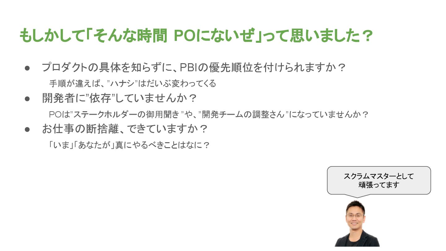 もしかして「そんな時間 POにないぜ」って思いました? • プロダクトの具体を知らずに、PBIの優先順位を付けられますか? 手順が違えば、”ハナシ”はだいぶ変わってくる • 開発者に”依存”していませんか? POは”ステークホルダーの御用聞き ”や、”開発チームの調整さん ”になっていませんか?