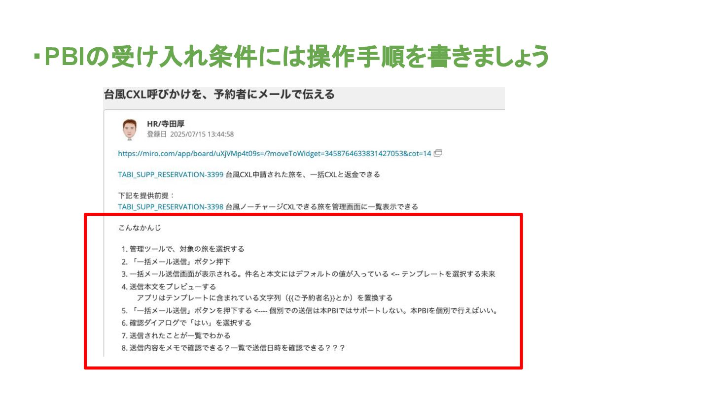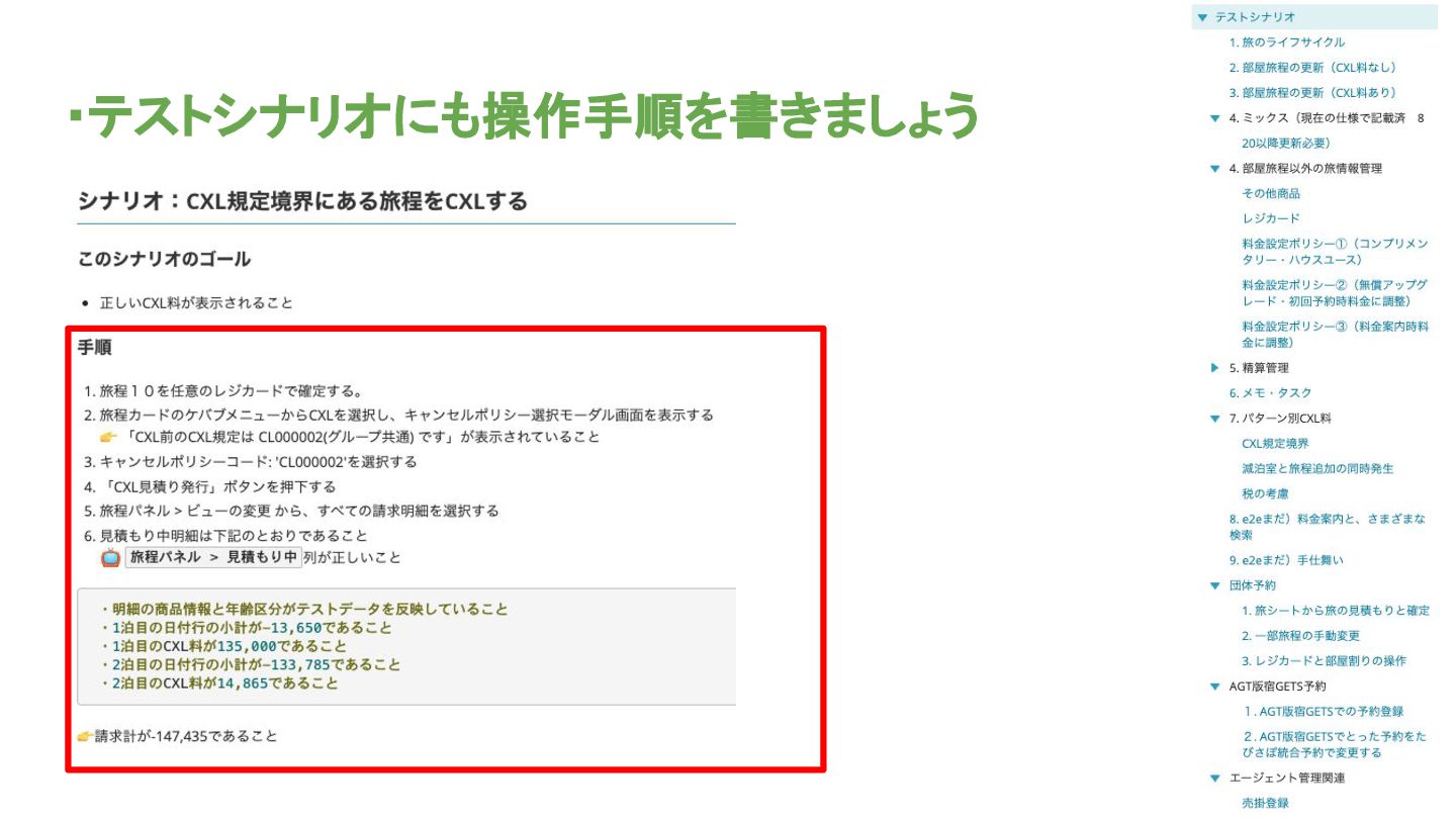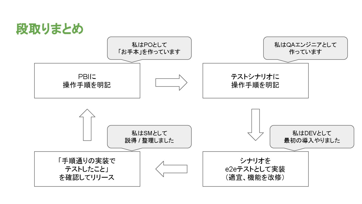 段取りまとめ PBIに 操作手順を明記 テストシナリオに 操作手順を明記 シナリオを e2eテストとして実装 (適宜、機能を改修) 「手順通りの実装で テストしたこと」