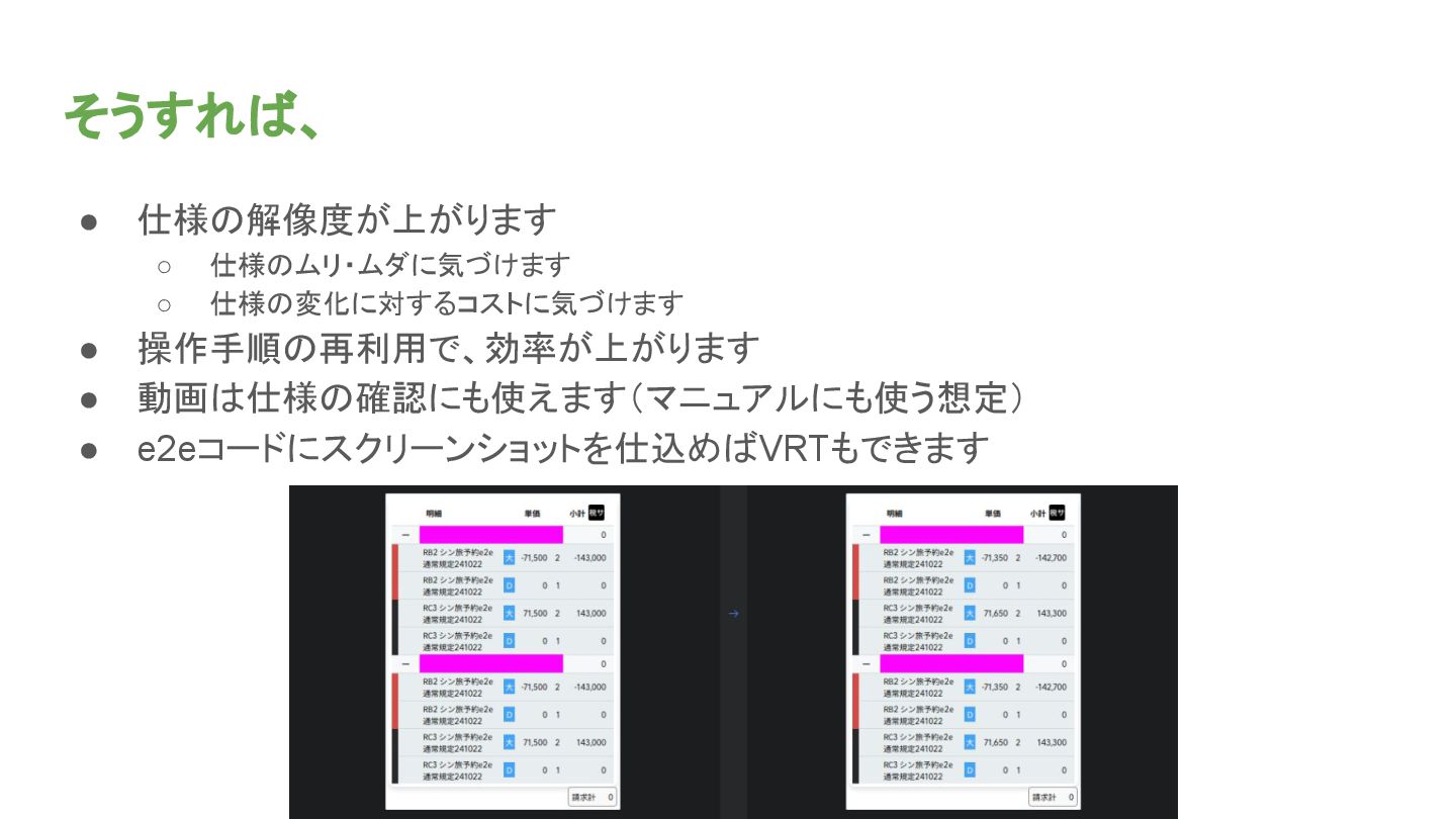 動画は仕様の確認にも使えます(マニュアルにも使う想定) • e2eコードにスクリーンショットを仕込めばVRTもできます
