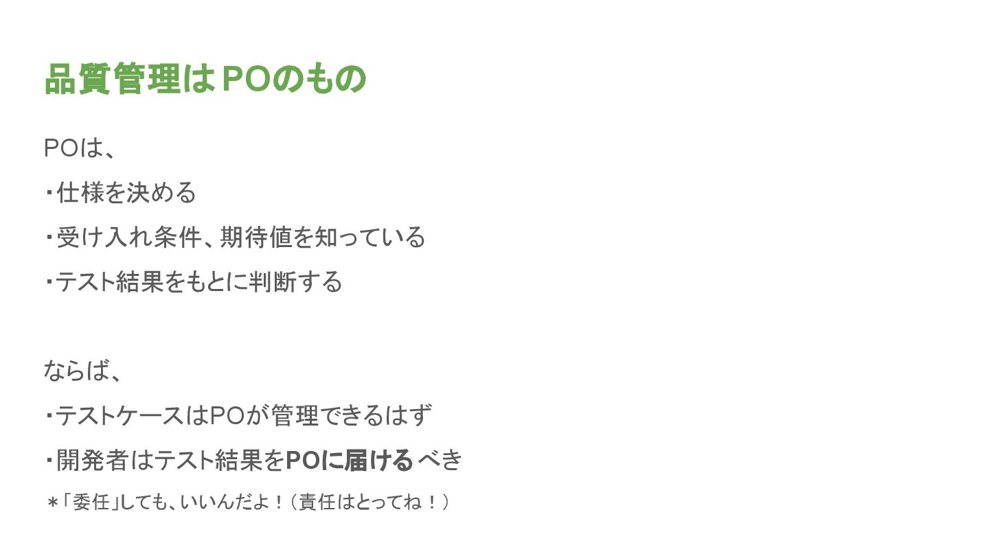 POは、 ・仕様を決める ・受け入れ条件、期待値を知っている ・テスト結果をもとに判断する ならば、 ・テストケースはPOが管理できるはず ・開発者はテスト結果をPOに届けるべき *「委任」しても、いいんだよ!(責任はとってね!) 品質管理は POのもの
