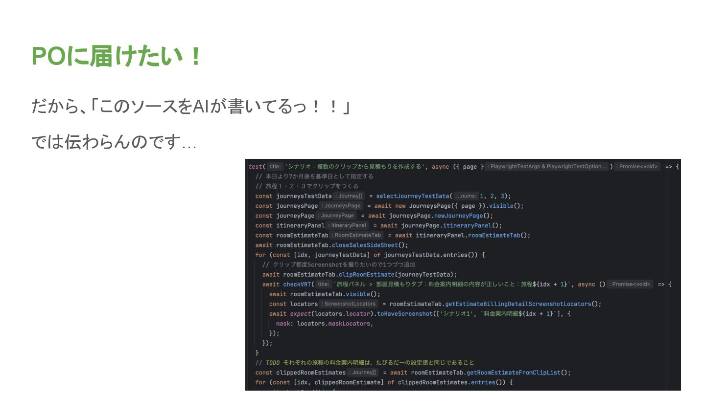 だから、「このソースをAIが書いてるっ!!」 では伝わらんのです… POに届けたい!