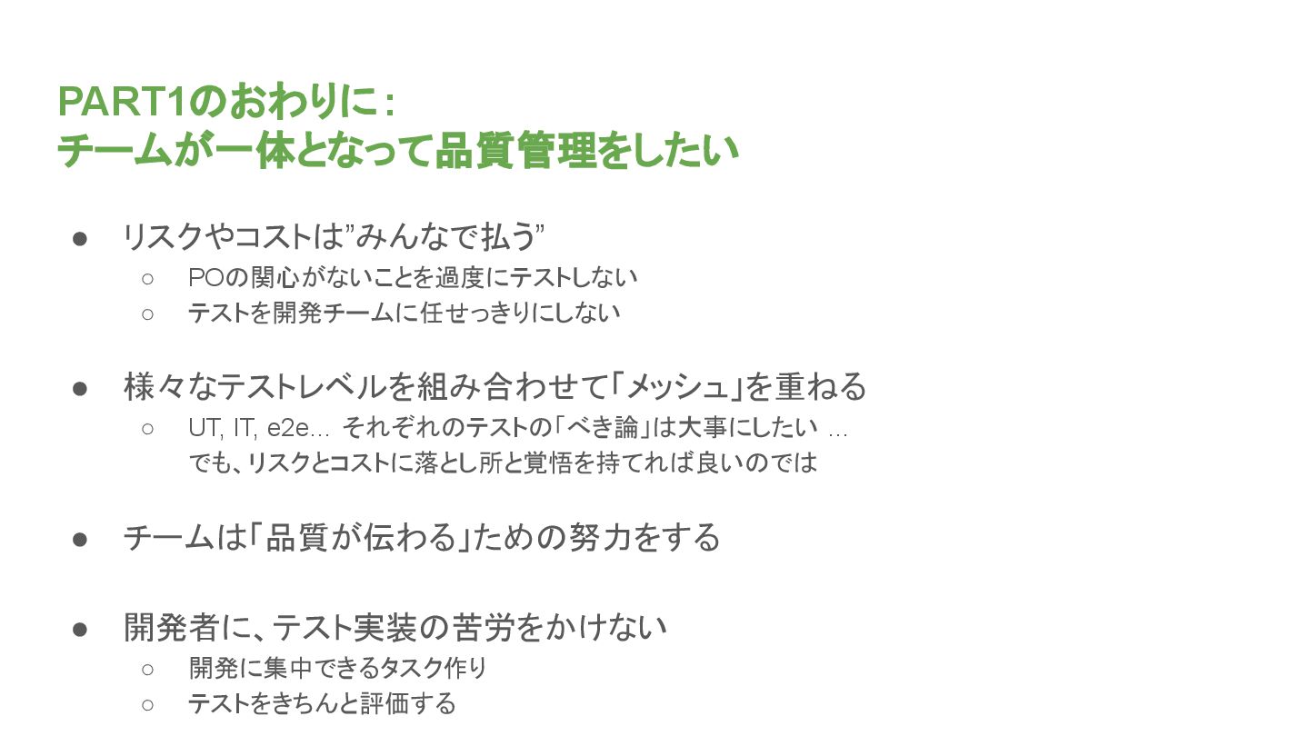 PART1のおわりに : チームが一体となって品質管理をしたい • リスクやコストは”みんなで払う” ◦ POの関心がないことを過度にテストしない ◦ テストを開発チームに任せっきりにしない •