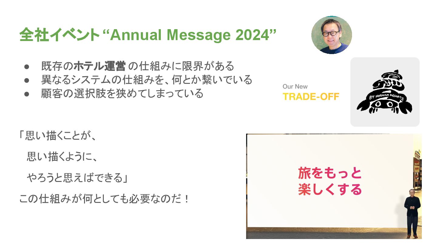 全社イベント “Annual Message 2024” • 既存のホテル運営 の仕組みに限界がある • 異なるシステムの仕組みを、何とか繋いでいる •