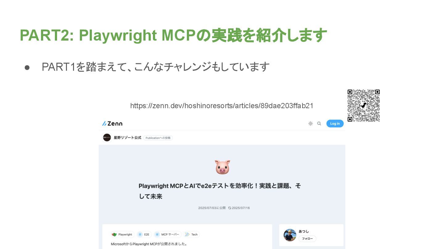 • PART1を踏まえて、こんなチャレンジもしています PART2: Playwright MCPの実践を紹介します https://zenn.dev/hoshinoresorts/articles/89dae203ffab21