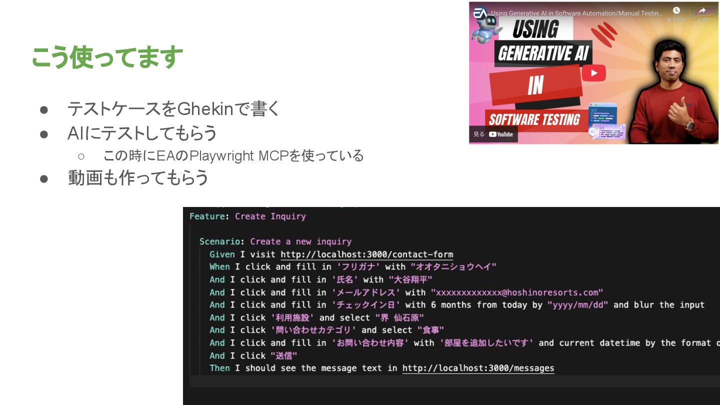 こう使ってます • テストケースをGhekinで書く • AIにテストしてもらう ◦ この時にEAのPlaywright MCPを使っている • 動画も作ってもらう