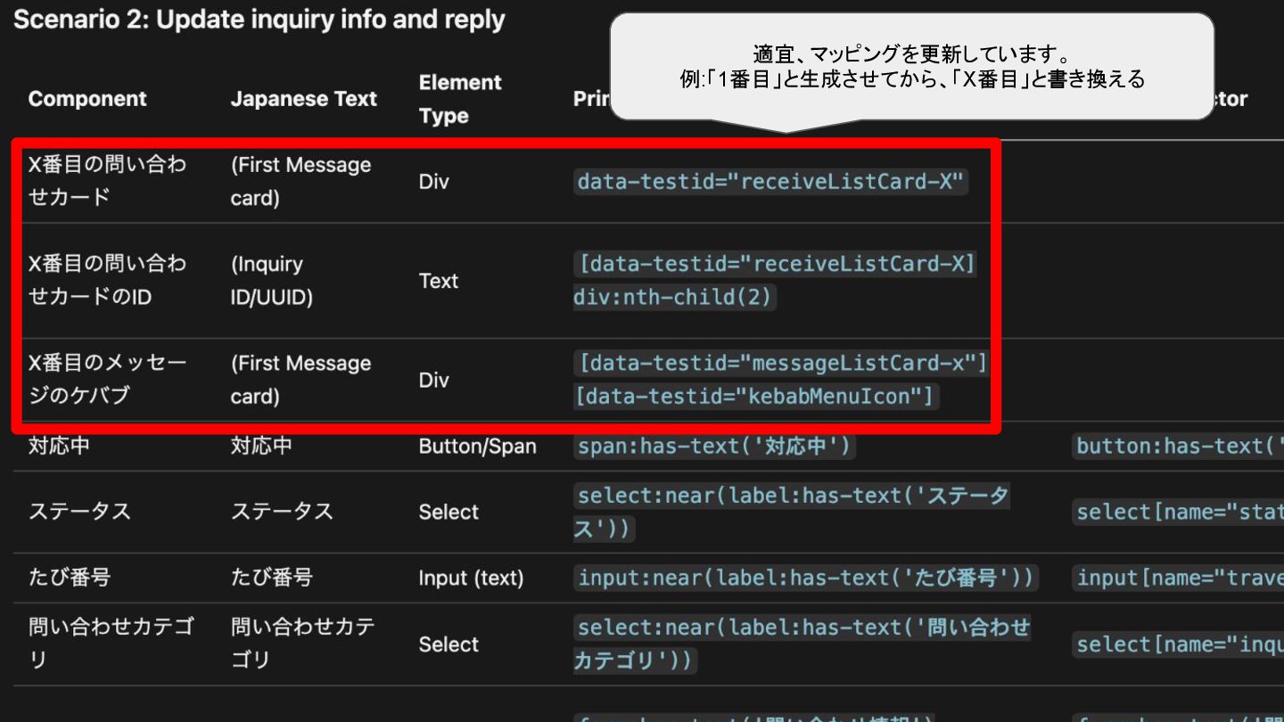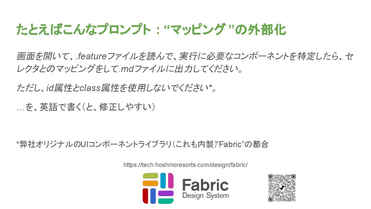 たとえばこんなプロンプト : “マッピング ”の外部化 画面を開いて、.featureファイルを読んで、実行に必要なコンポーネントを特定したら、セ レクタとのマッピングをして.mdファイルに出力してください。 ただし、id属性とclass属性を使用しないでください*。 …を、英語で書く(と、修正しやすい) *弊社オリジナルのUIコンポーネントライブラリ(これも内製) ”Fabric”の都合