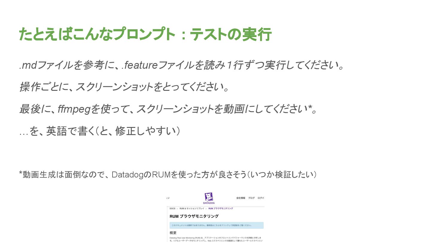 .mdファイルを参考に、.featureファイルを読み1行ずつ実行してください。 操作ごとに、スクリーンショットをとってください。 最後に、ffmpegを使って、スクリーンショットを動画にしてください*。 …を、英語で書く(と、修正しやすい) *動画生成は面倒なので、 DatadogのRUMを使った方が良さそう(いつか検証したい) たとえばこんなプロンプト : テストの実行