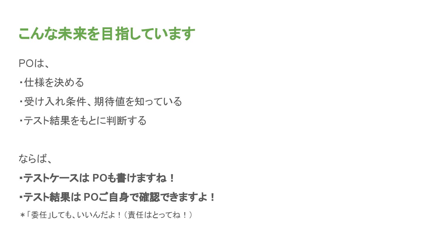 こんな未来を目指しています POは、 ・仕様を決める ・受け入れ条件、期待値を知っている ・テスト結果をもとに判断する ならば、 ・テストケースは POも書けますね! ・テスト結果は POご自身で確認できますよ!