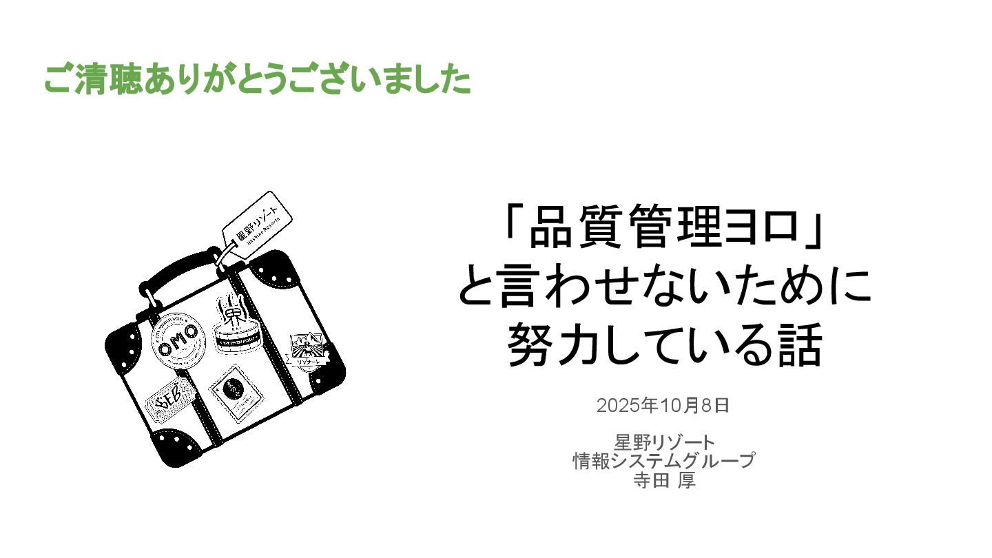 「品質管理ヨロ」 と言わせないために 努力している話 2025年10月8日 星野リゾート 情報システムグループ 寺田 厚 ご清聴ありがとうございました