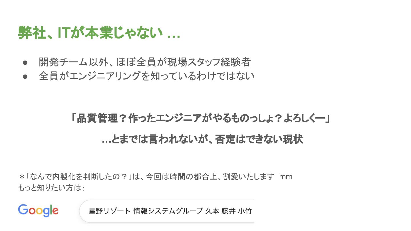 弊社、ITが本業じゃない … • 開発チーム以外、ほぼ全員が現場スタッフ経験者 • 全員がエンジニアリングを知っているわけではない 「品質管理?作ったエンジニアがやるものっしょ?よろしくー」 …とまでは言われないが、否定はできない現状 *「なんで内製化を判断したの?」は、今回は時間の都合上、割愛いたします mm