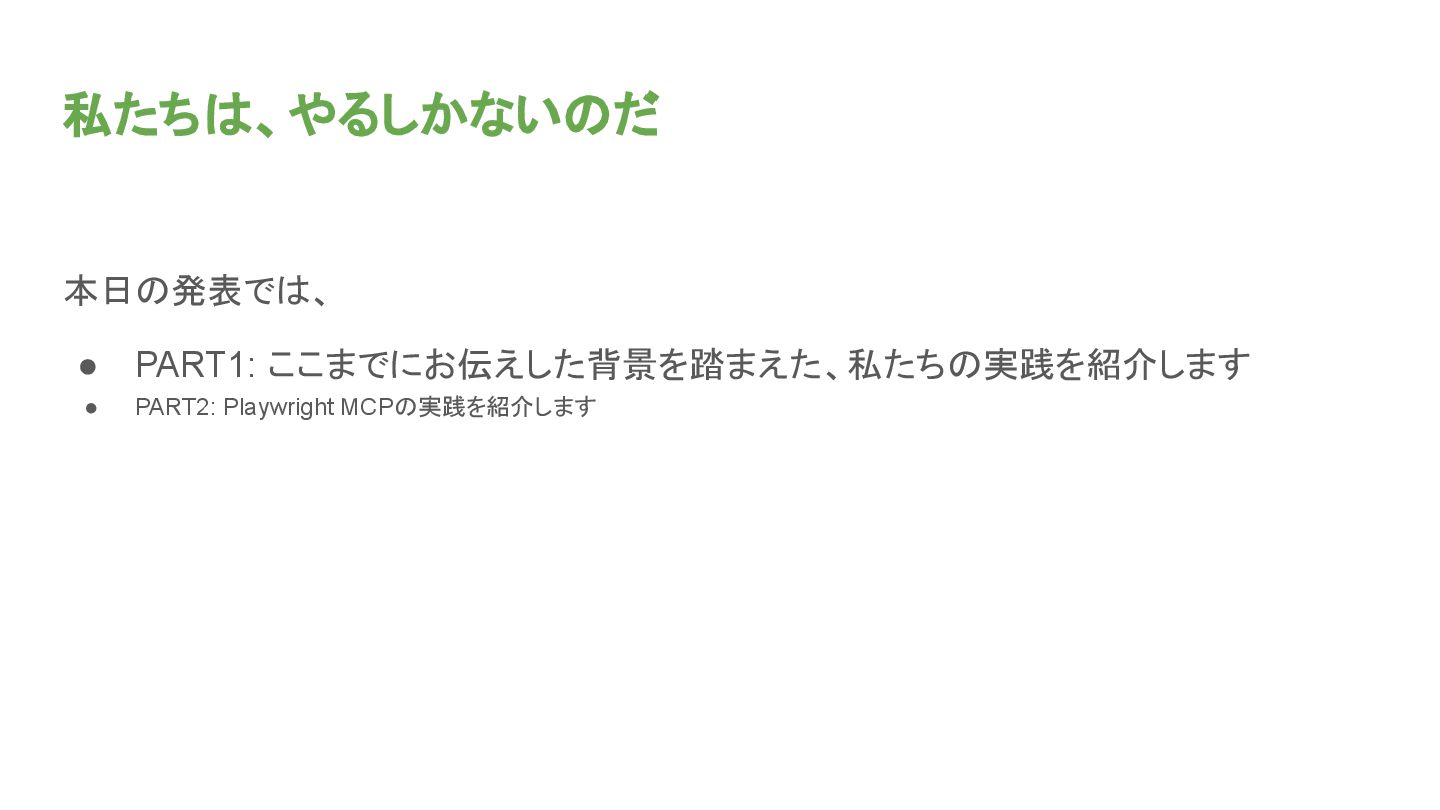 私たちは、やるしかないのだ 本日の発表では、 • PART1: ここまでにお伝えした背景を踏まえた、私たちの実践を紹介します • PART2: Playwright MCPの実践を紹介します
