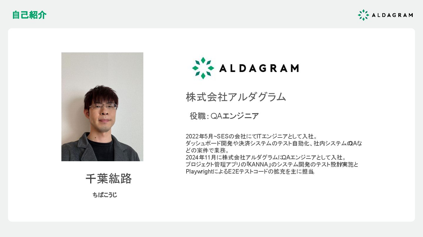 千葉紘路 株式会社アルダグラム 役職:QAエンジニア 2022年5月~SESの会社にてITエンジニアとして入社。 ダッシュボード開発や決済システムのテスト自動化、社内システムの QAな どの案件で業務。