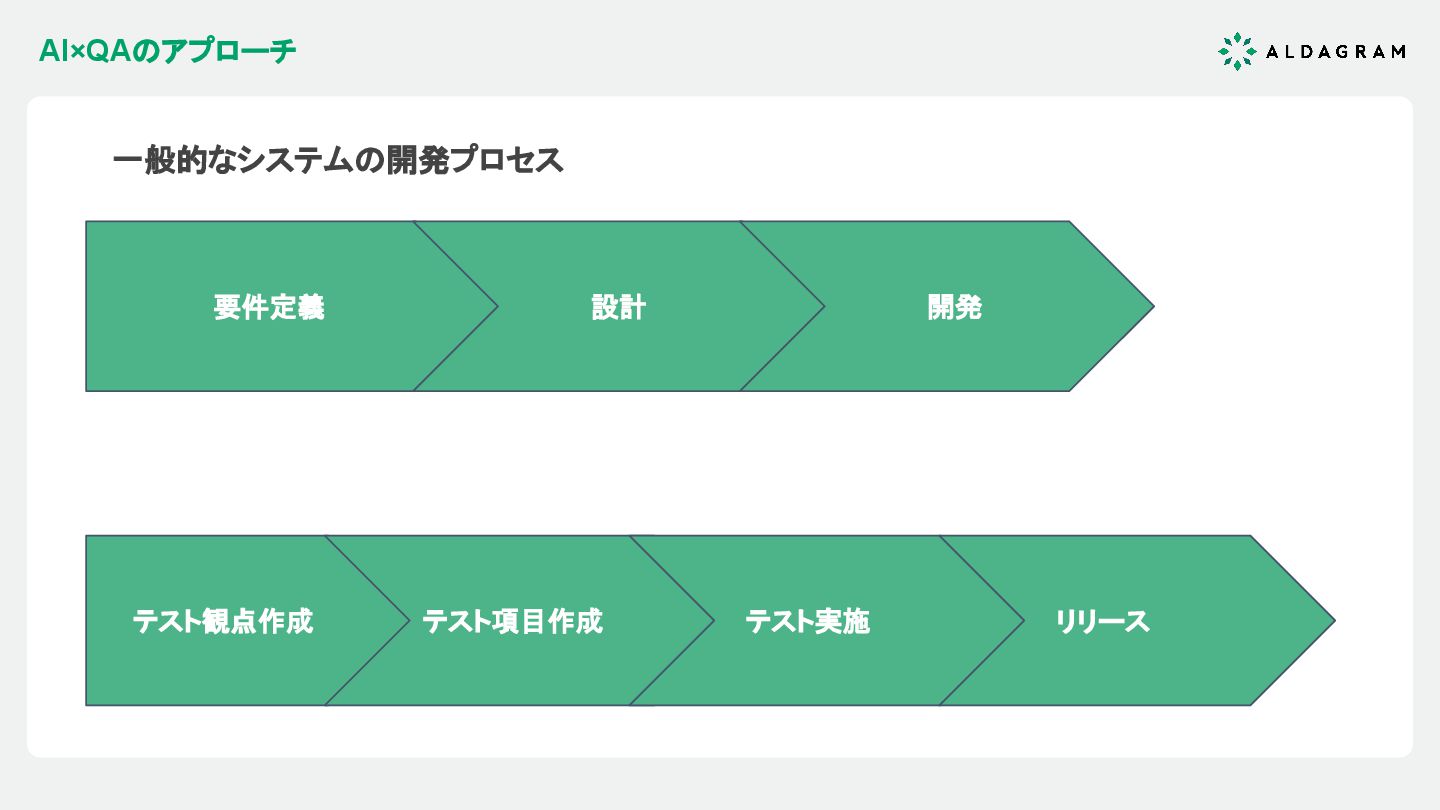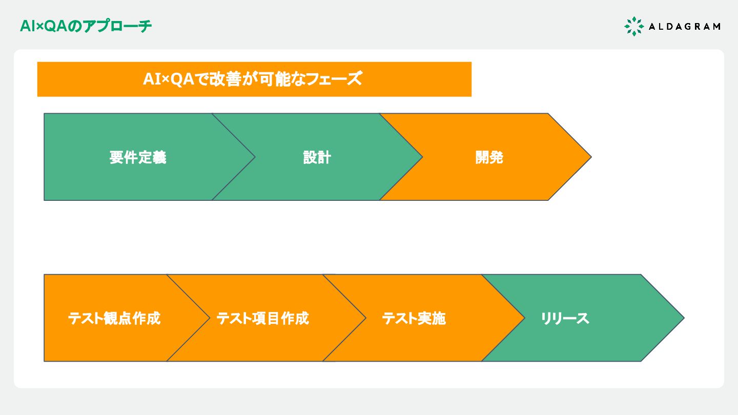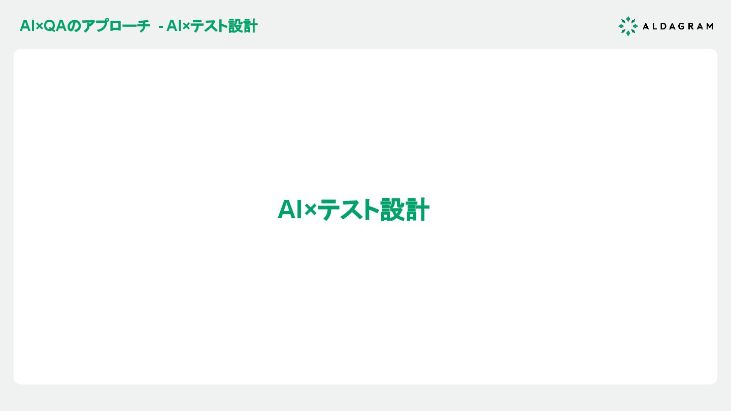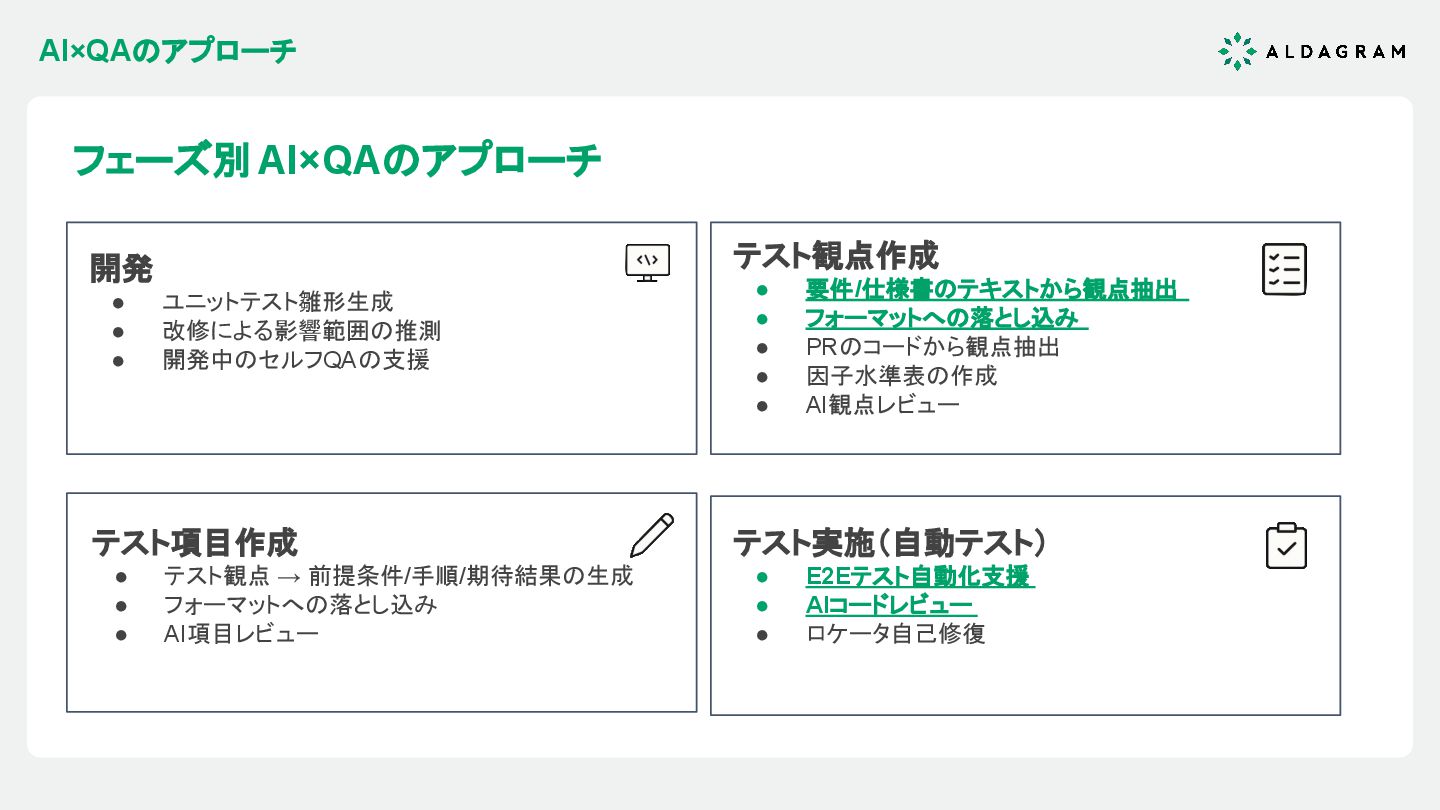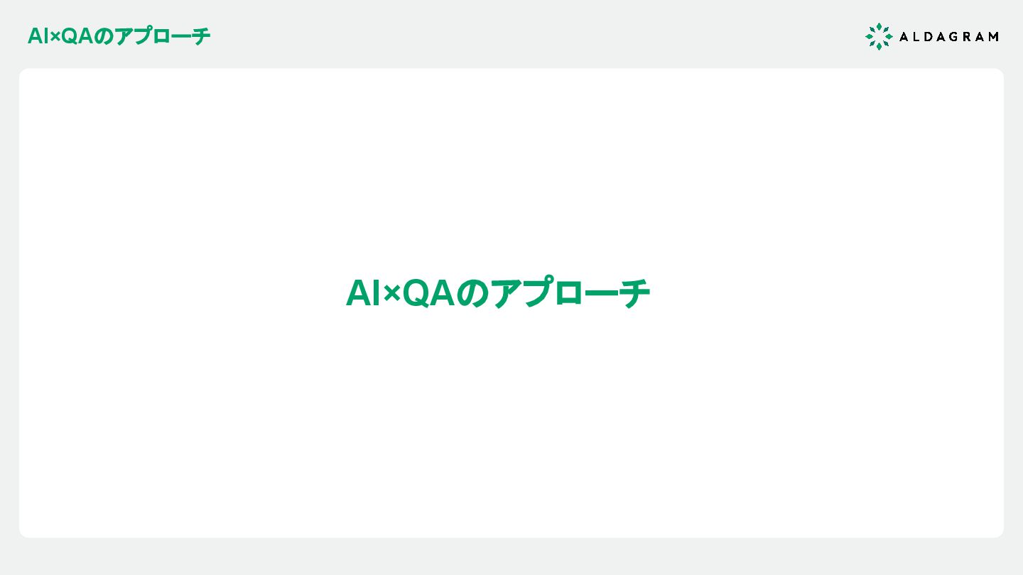 要件/仕様書のテキストから観点抽出 • フォーマットへの落とし込み • PRのコードから観点抽出 • 因子水準表の作成 • AI観点レビュー テスト項目作成 • テスト観点 → 前提条件/手順/期待結果の生成 • フォーマットへの落とし込み • AI項目レビュー テスト実施(自動テスト) • E2Eテスト自動化支援 • AIコードレビュー • ロケータ自己修復 フェーズ別 AI×QAのアプローチ