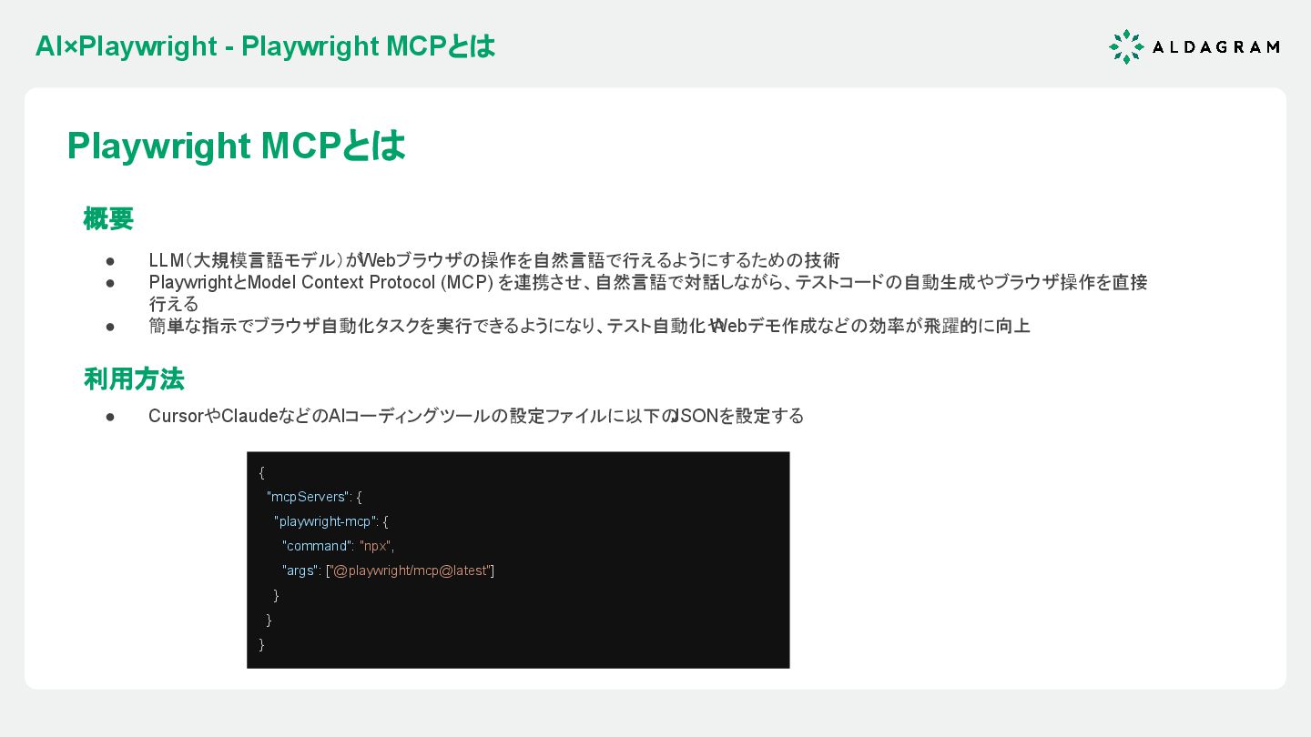 • PlaywrightとModel Context Protocol (MCP) を連携させ、自然言語で対話しながら、テストコードの自動生成やブラウザ操作を直接 行える • 簡単な指示でブラウザ自動化タスクを実行できるようになり、テスト自動化や Webデモ作成などの効率が飛躍的に向上 利用方法 • CursorやClaudeなどのAIコーディングツールの設定ファイルに以下の JSONを設定する { "mcpServers": { "playwright-mcp": { "command": "npx", "args": ["@playwright/mcp@latest"] } } }