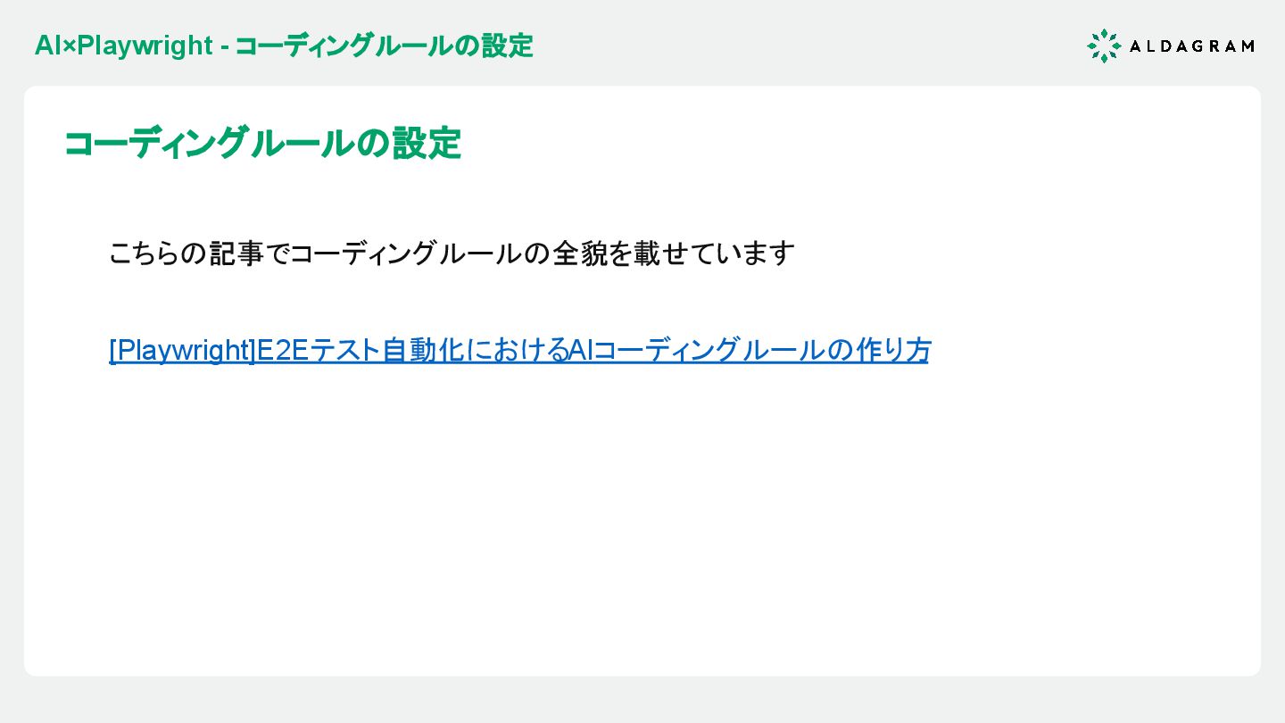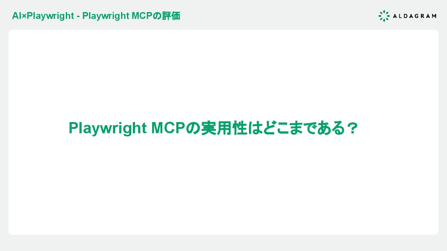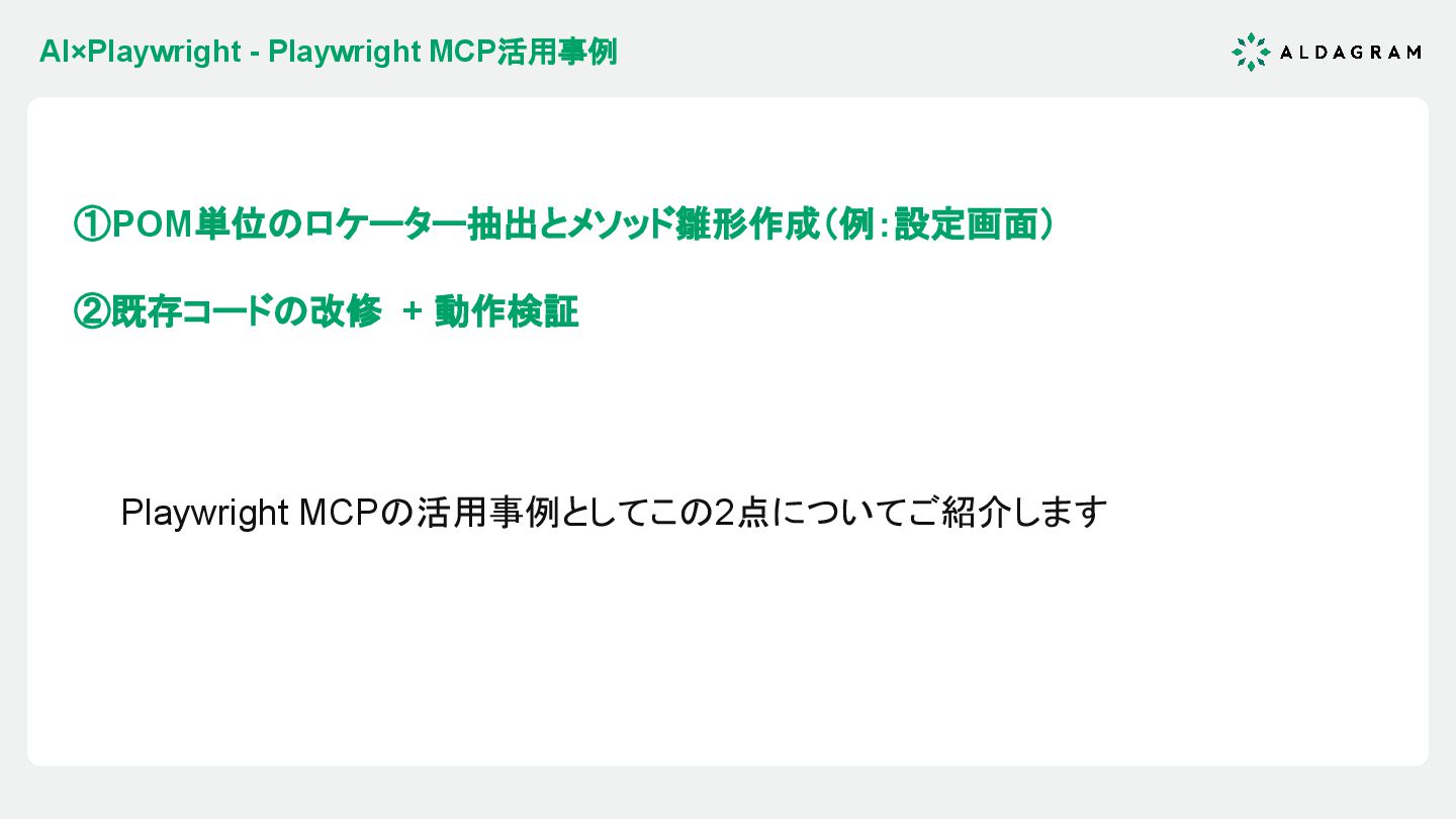 • Playwright MCPの評価 • Playwright MCP活用事例 • コーディングルールの設定 • AI×テスト設計 • 今後の展望