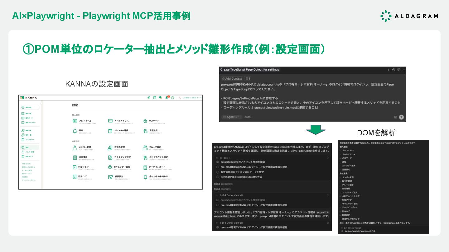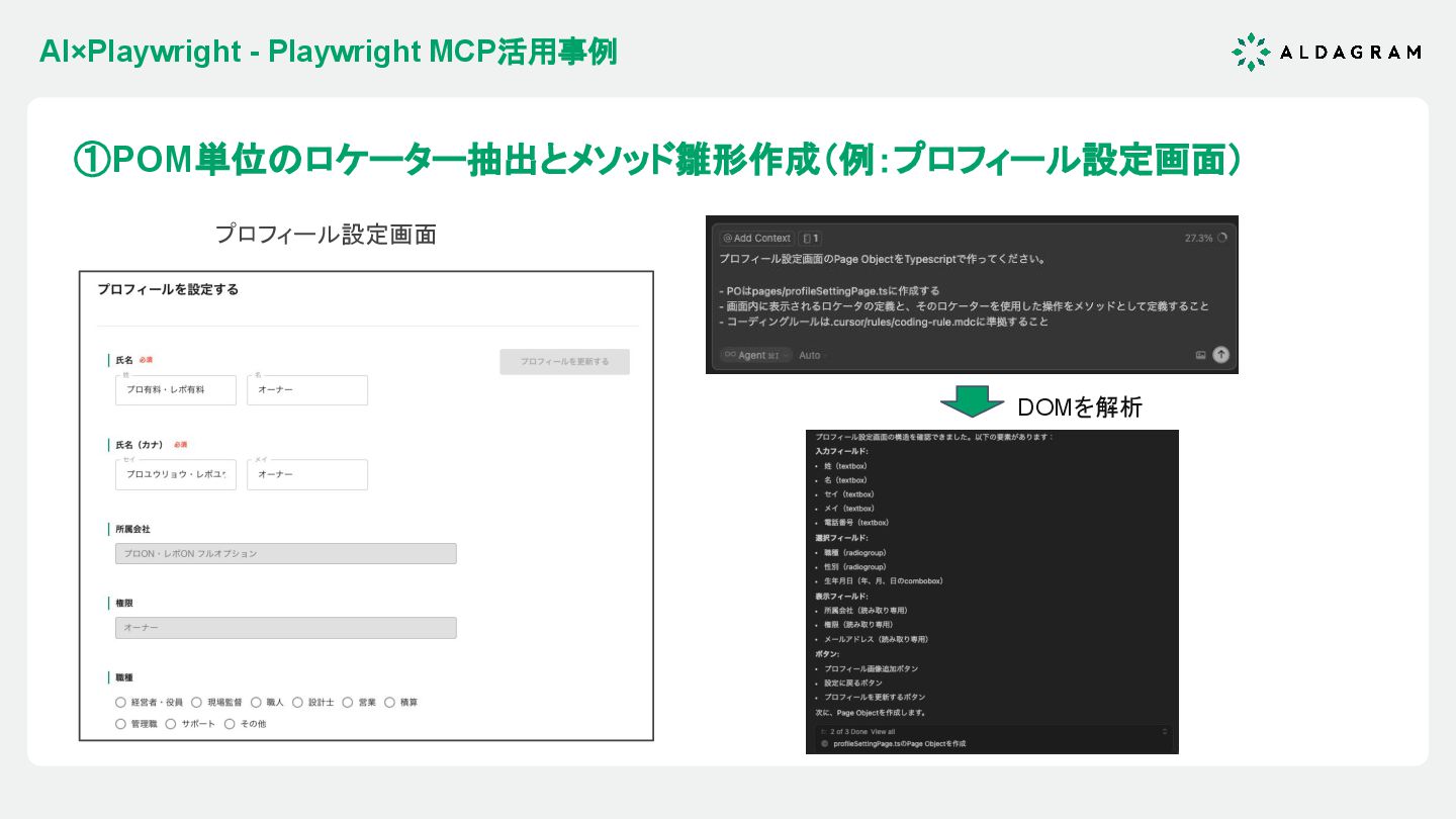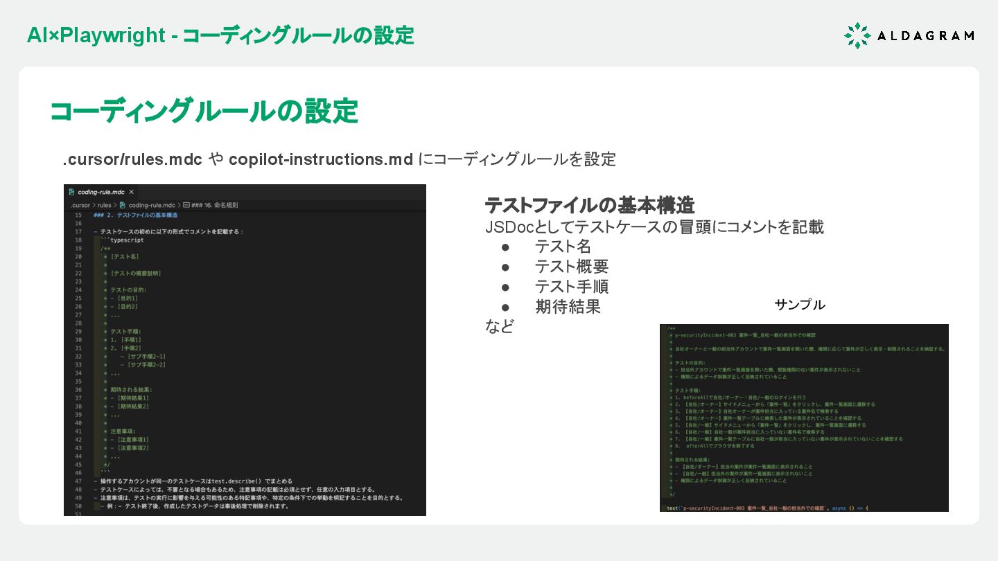 • Playwright MCPの評価 • Playwright MCP活用事例 • コーディングルールの設定 • AI×テスト設計 • 今後の展望