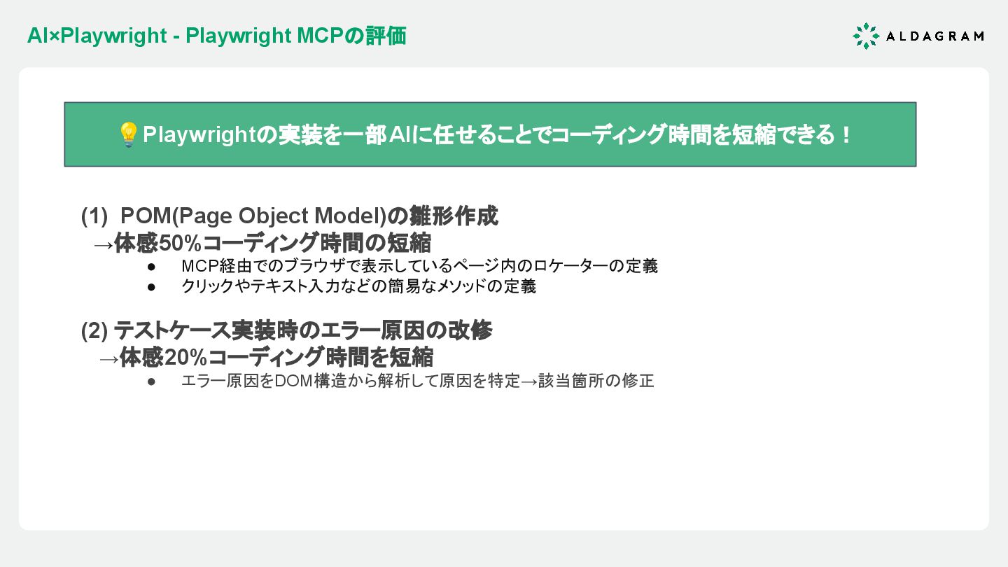 テストケース実装時のエラー原因の改修  →体感20%コーディング時間を短縮 • エラー原因をDOM構造から解析して原因を特定→該当箇所の修正 AI×Playwright - Playwright MCPの評価 💡Playwrightの実装を一部AIに任せることでコーディング時間を短縮できる!