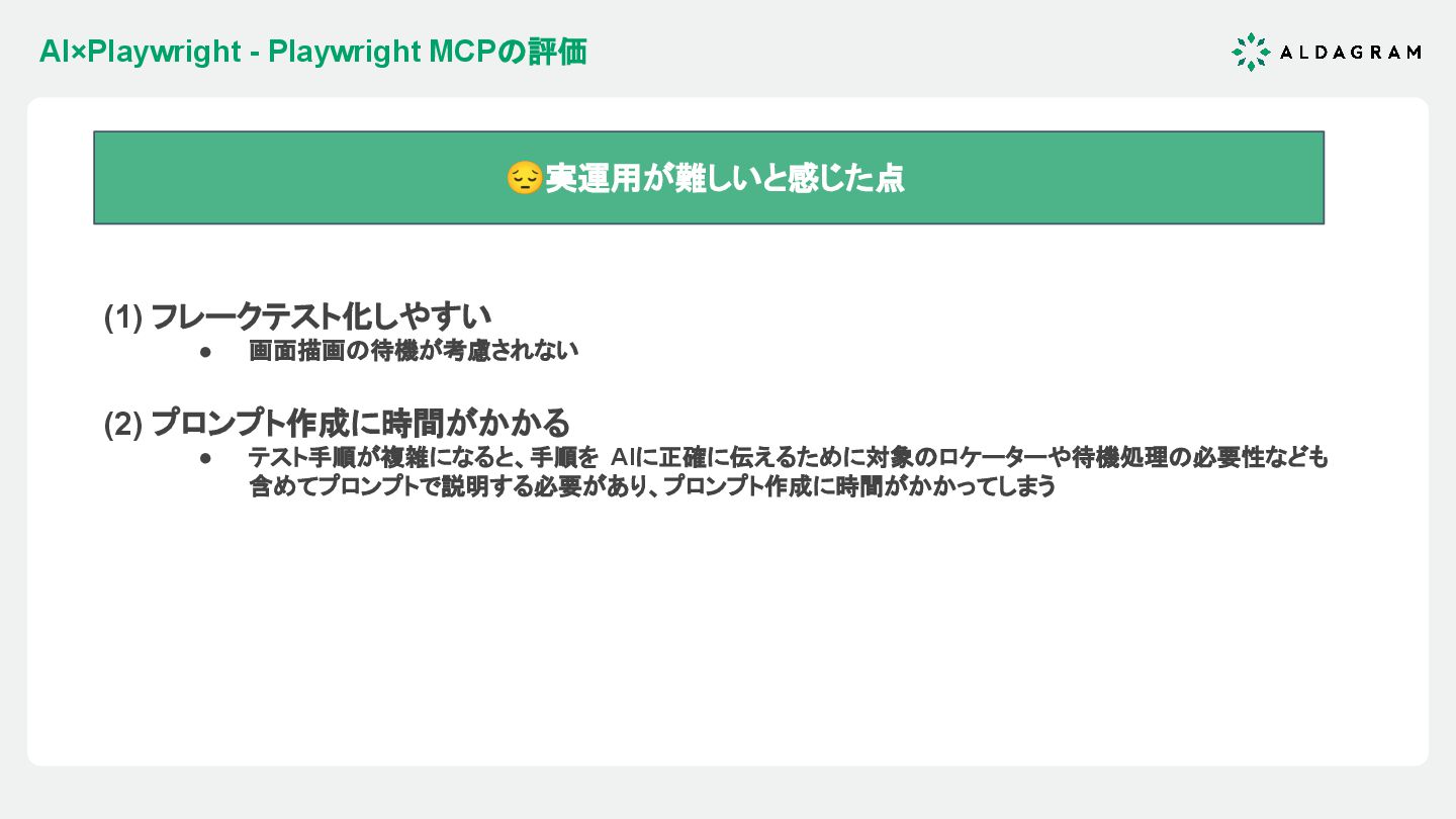10. AI×Playwright - Playwright MCPの評価 😔実運用が難しいと感じた点 (1) フレークテスト化しやすい • 画面描画の待機が考慮されない (2)