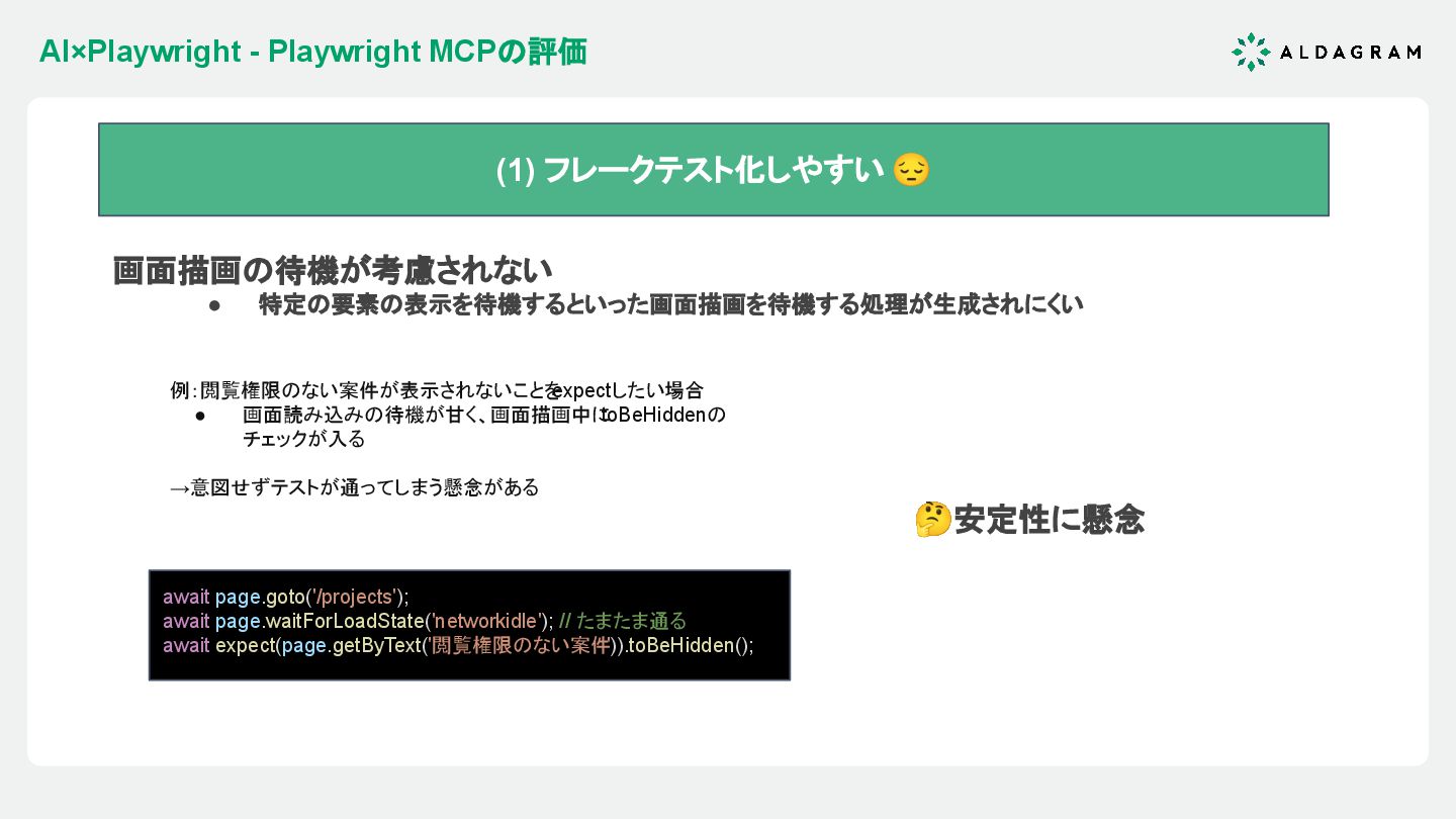 page.waitForLoadState('networkidle'); // たまたま通る await expect(page.getByText('閲覧権限のない案件 ')).toBeHidden(); 例:閲覧権限のない案件が表示されないことを expectしたい場合 • 画面読み込みの待機が甘く、画面描画中に toBeHiddenの チェックが入る →意図せずテストが通ってしまう懸念がある 🤔安定性に懸念 (1) フレークテスト化しやすい 😔