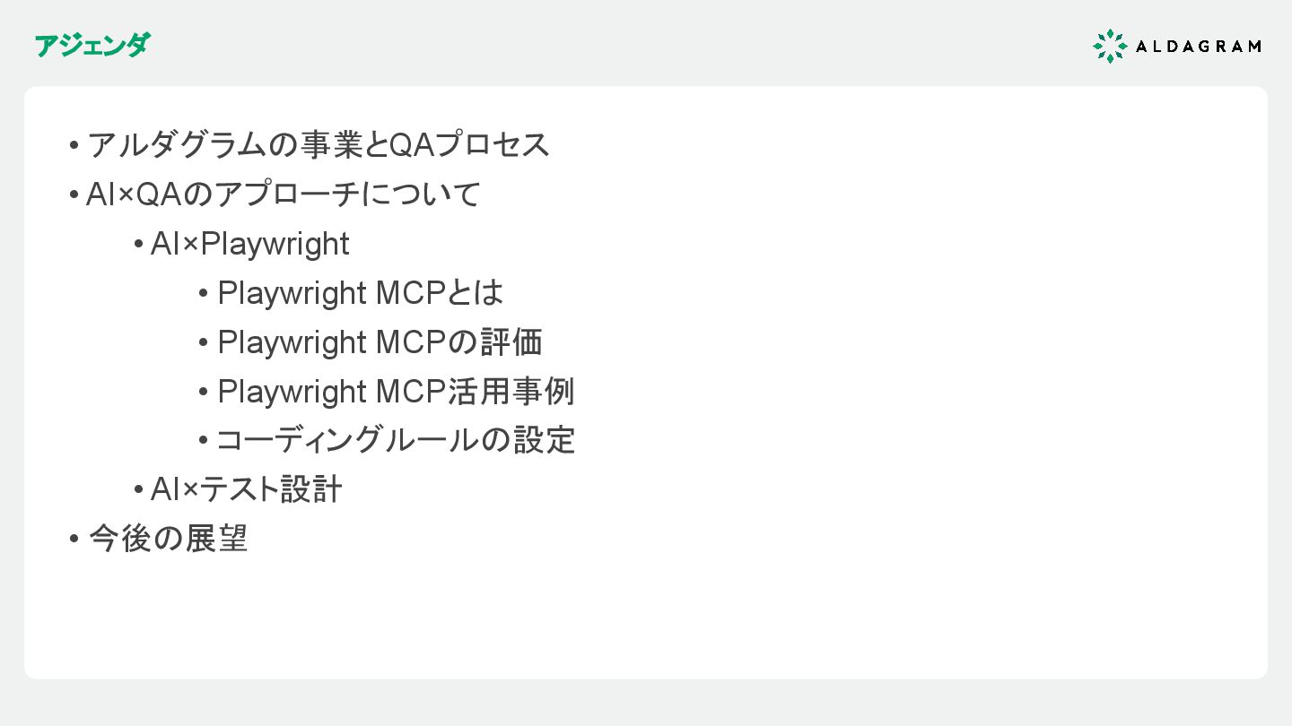 2. アジェンダ • アルダグラムの事業とQAプロセス • AI×QAのアプローチについて • AI×Playwright • Playwright MCPとは