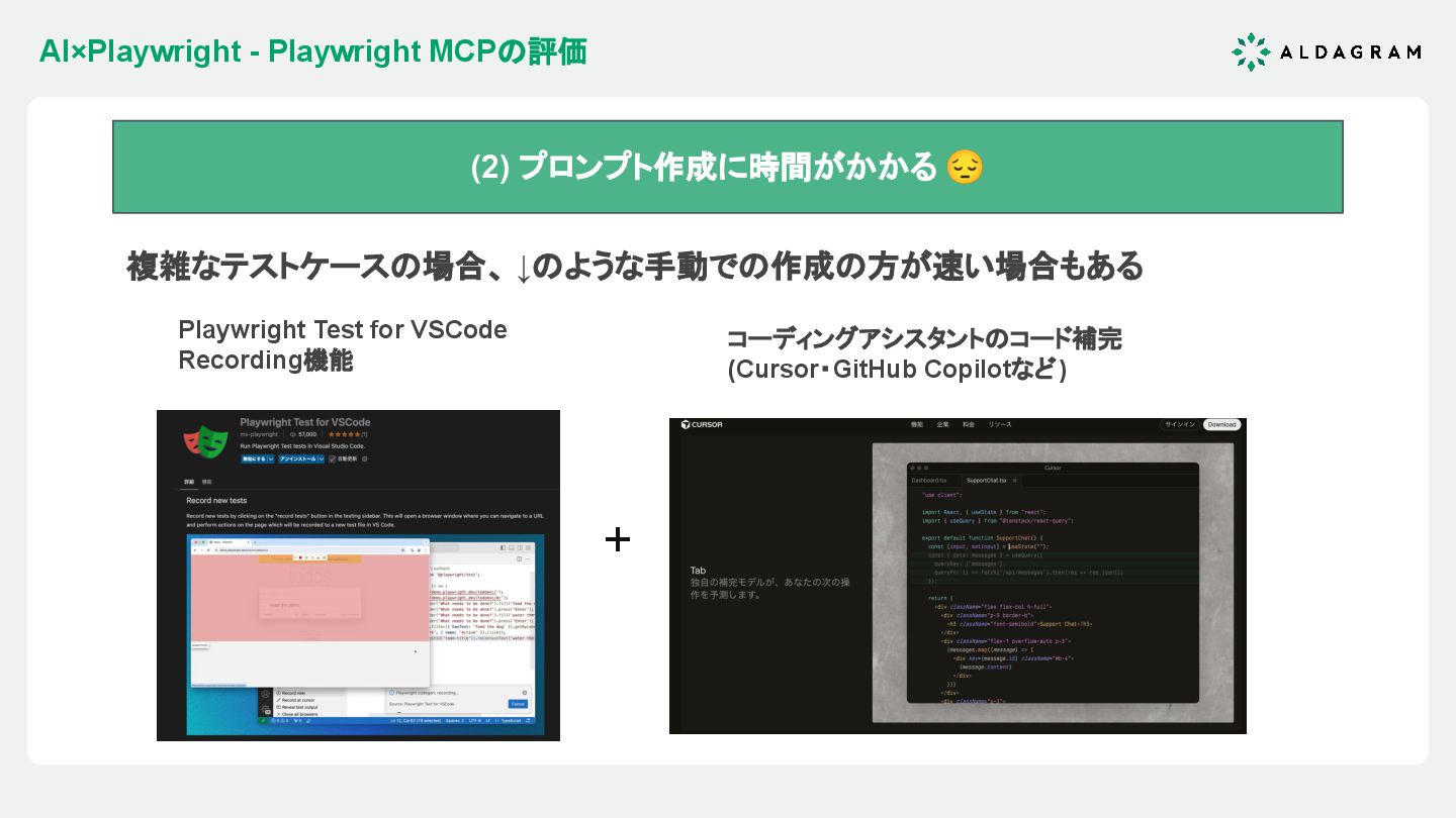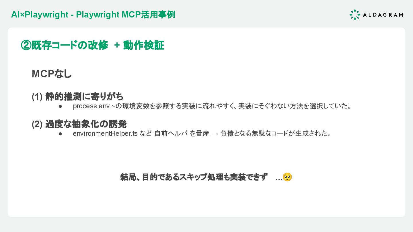 15. AI×Playwright - Playwright MCP活用事例 ②既存コードの改修 + 動作検証 MCPなし (1) 静的推測に寄りがち