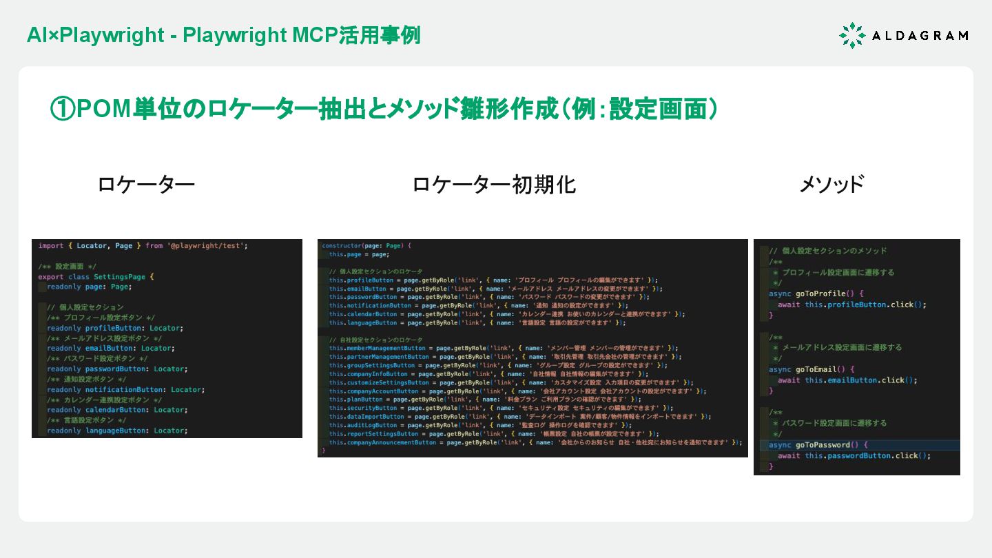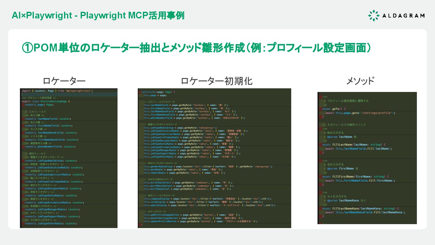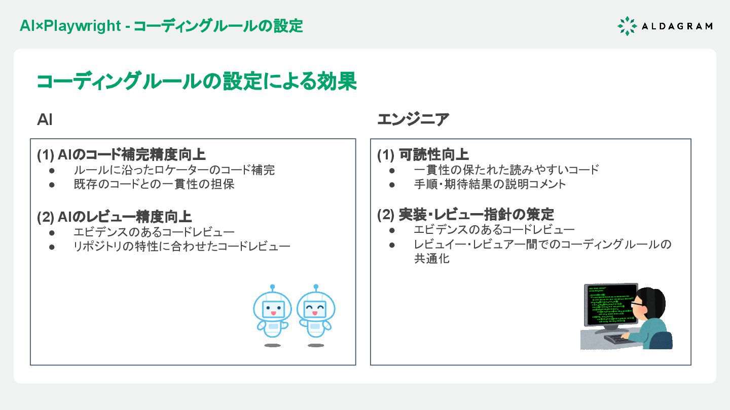 • リポジトリの特性に合わせたコードレビュー (1) 可読性向上 • 一貫性の保たれた読みやすいコード • 手順・期待結果の説明コメント (2) 実装・レビュー指針の策定 • エビデンスのあるコードレビュー • レビュイー・レビュアー間でのコーディングルールの 共通化 AI×Playwright - コーディングルールの設定 コーディングルールの設定による効果 AI エンジニア