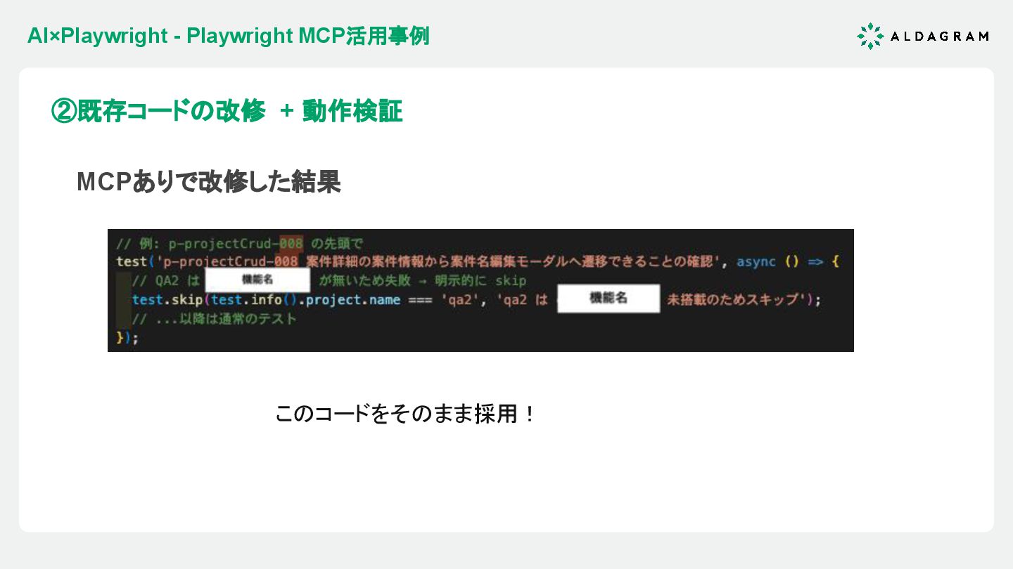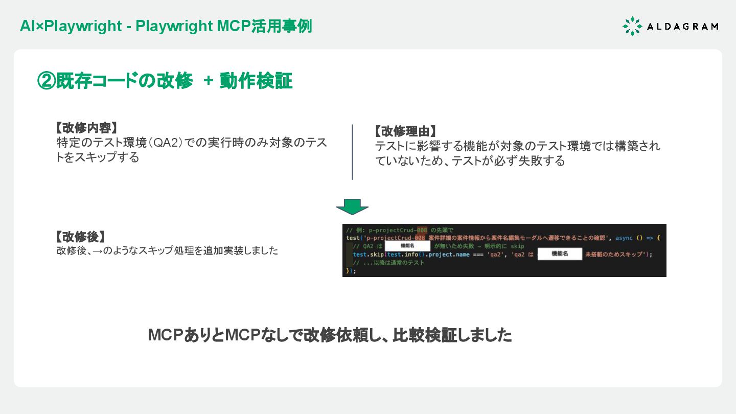 14. AI×Playwright - Playwright MCP活用事例 ②既存コードの改修 + 動作検証 【改修内容】 特定のテスト環境(QA2)での実行時のみ対象のテス トをスキップする