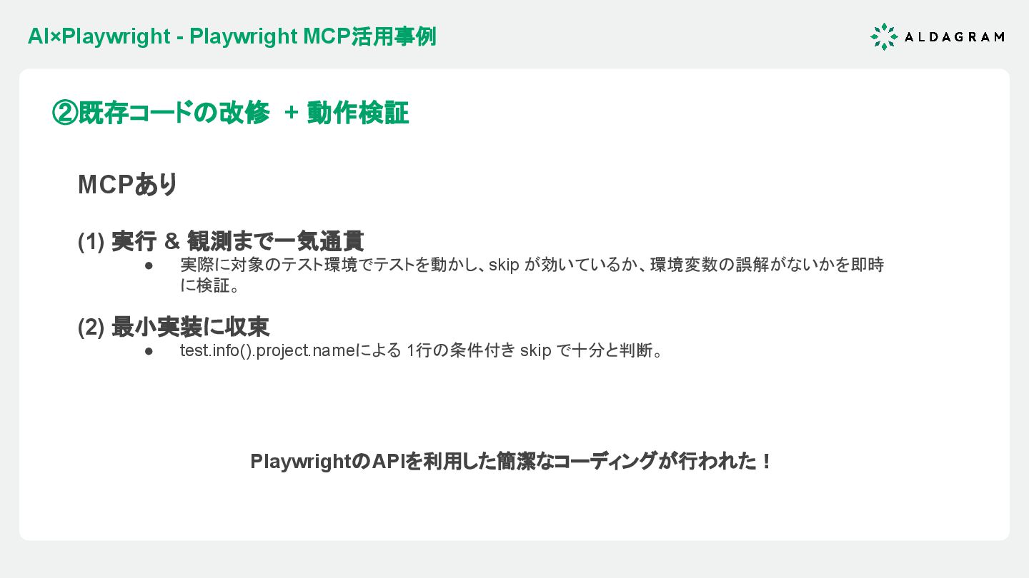 & 観測まで一気通貫 • 実際に対象のテスト環境でテストを動かし、skip が効いているか、環境変数の誤解がないかを即時 に検証。 (2) 最小実装に収束 • test.info().project.nameによる 1行の条件付き skip で十分と判断。 PlaywrightのAPIを利用した簡潔なコーディングが行われた!