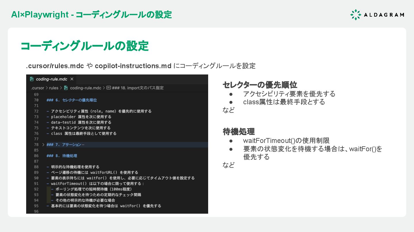 アクセシビリティ要素を優先する • class属性は最終手段とする など 待機処理 • waitForTimeout()の使用制限 • 要素の状態変化を待機する場合は、waitFor()を 優先する など