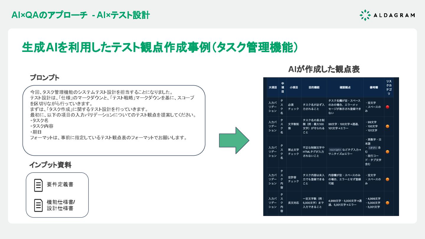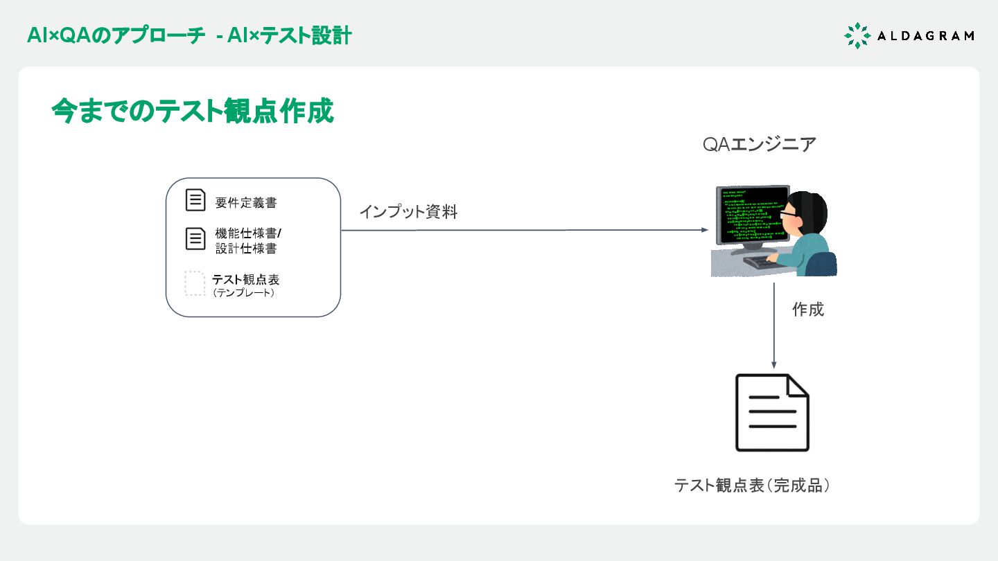 19. AI×QAのアプローチ - AI×テスト設計 生成AIを利用したテスト観点作成 インプット資料 機能仕様書/ 設計仕様書 要件定義書 テスト観点の フォーマット