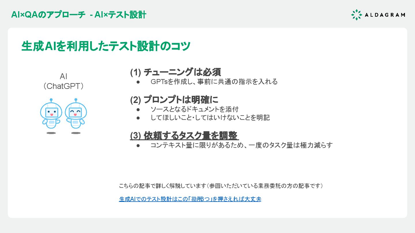 20. AI×QAのアプローチ - AI×テスト設計 生成AIを利用したテスト設計のコツ AI (ChatGPT) 生成AIでのテスト設計はこの「勘所 3つ」を押さえれば大丈夫 こちらの記事で詳しく解説しています(参画いただいている業務委託の方の記事です) (1)