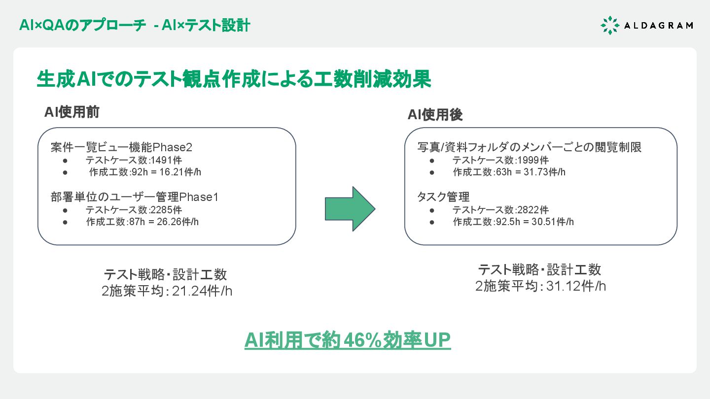 • 作成工数:87h = 26.26件/h AI×QAのアプローチ - AI×テスト設計 生成AIでのテスト観点作成による工数削減効果 AI使用前 AI使用後 写真/資料フォルダのメンバーごとの閲覧制限 • テストケース数:1999件 • 作成工数:63h = 31.73件/h タスク管理 • テストケース数:2822件 • 作成工数:92.5h = 30.51件/h AI利用で約46%効率UP テスト戦略・設計工数 2施策平均:31.12件/h テスト戦略・設計工数 2施策平均:21.24件/h