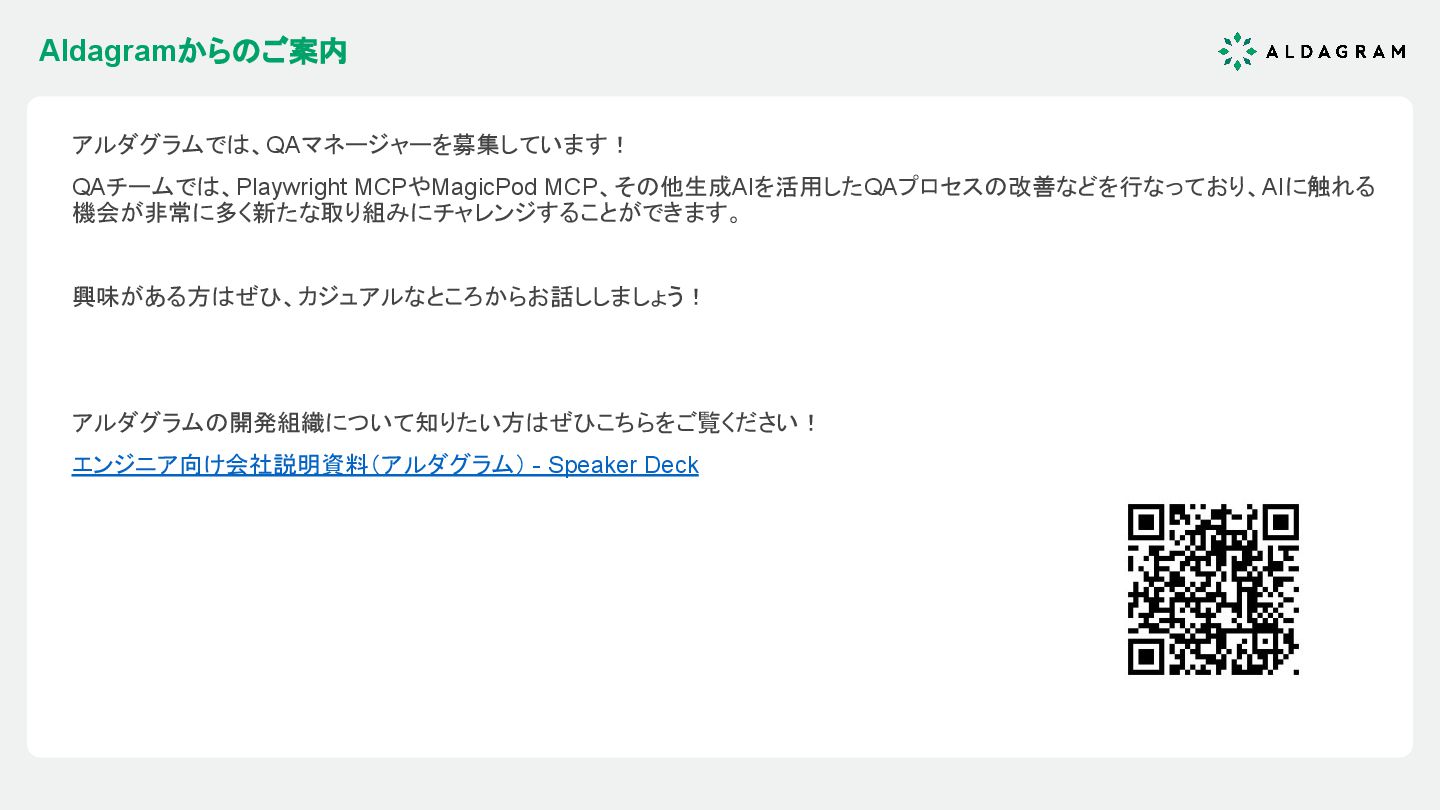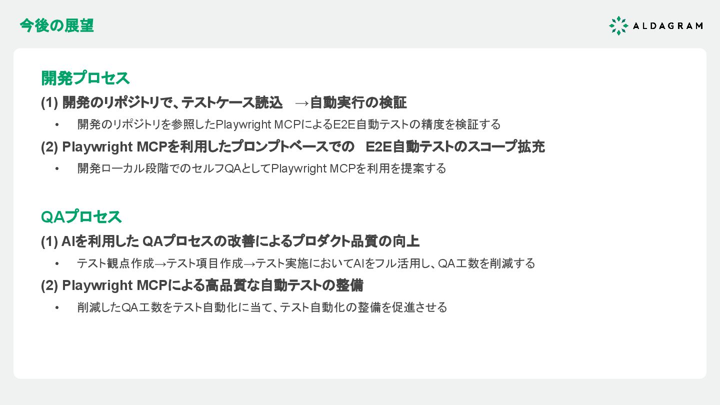 E2E自動テストのスコープ拡充 • 開発ローカル段階でのセルフQAとしてPlaywright MCPを利用を提案する QAプロセス (1) AIを利用した QAプロセスの改善によるプロダクト品質の向上 • テスト観点作成→テスト項目作成→テスト実施においてAIをフル活用し、QA工数を削減する (2) Playwright MCPによる高品質な自動テストの整備 • 削減したQA工数をテスト自動化に当て、テスト自動化の整備を促進させる 今後の展望