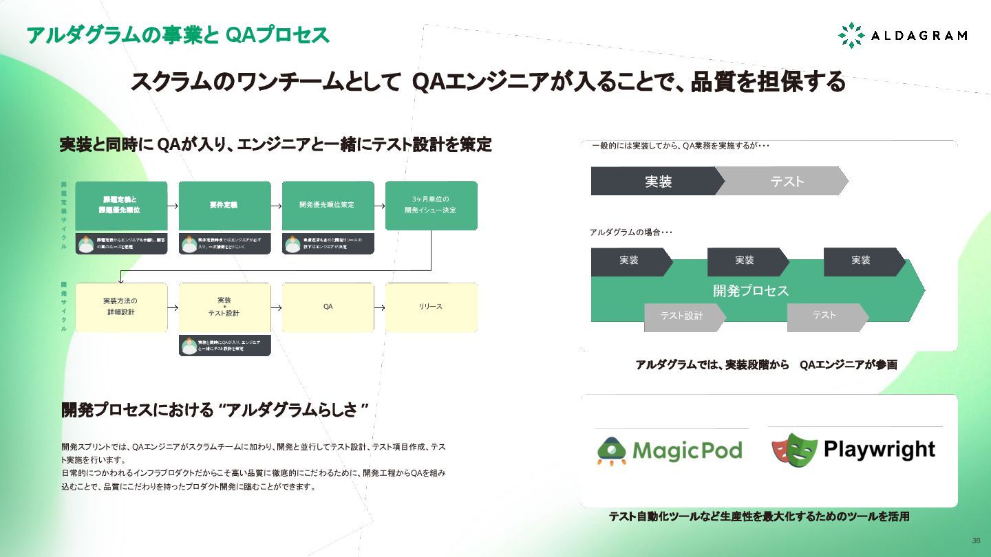 開発イシュー決定 リリース 開発プロセスにおける “アルダグラムらしさ ” 開発スプリントでは、QAエンジニアがスクラムチームに加わり、開発と並行してテスト設計、テスト項目作成、テス ト実施を行います。 日常的につかわれるインフラプロダクトだからこそ高い品質に徹底的にこだわるために、開発工程からQAを組み 込むことで、品質にこだわりを持ったプロダクト開発に臨むことができます。 実装と同時に QAが入り、エンジニアと一緒にテスト設計を策定 テスト自動化ツールなど生産性を最大化するためのツールを活用 アルダグラムでは、実装段階から QAエンジニアが参画 一般的には実装してから、QA業務を実施するが・・・ アルダグラムの場合・・・ 実装 テスト 開発プロセス 実装 実装 実装 テスト設計 テスト アルダグラムの事業と QAプロセス